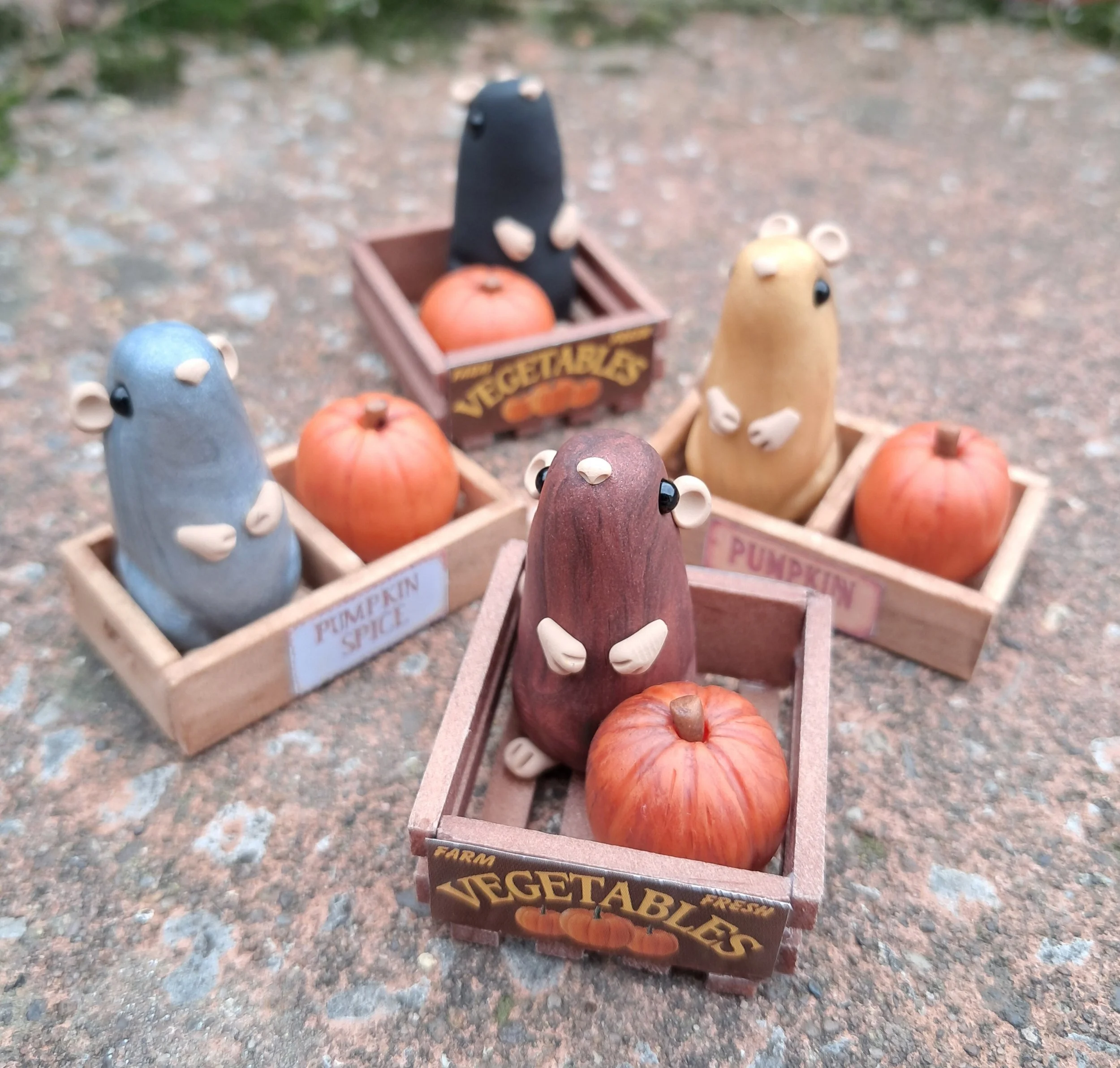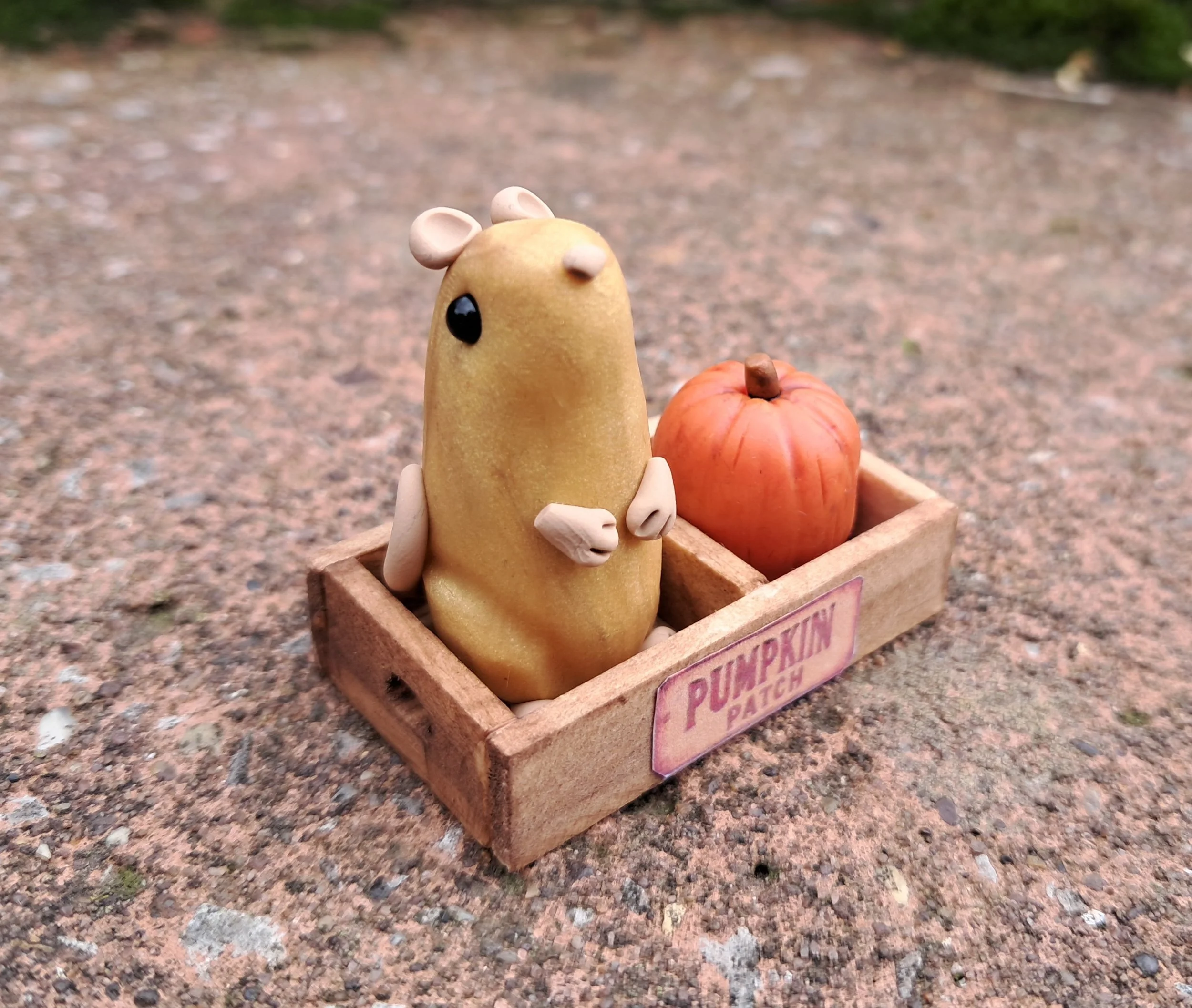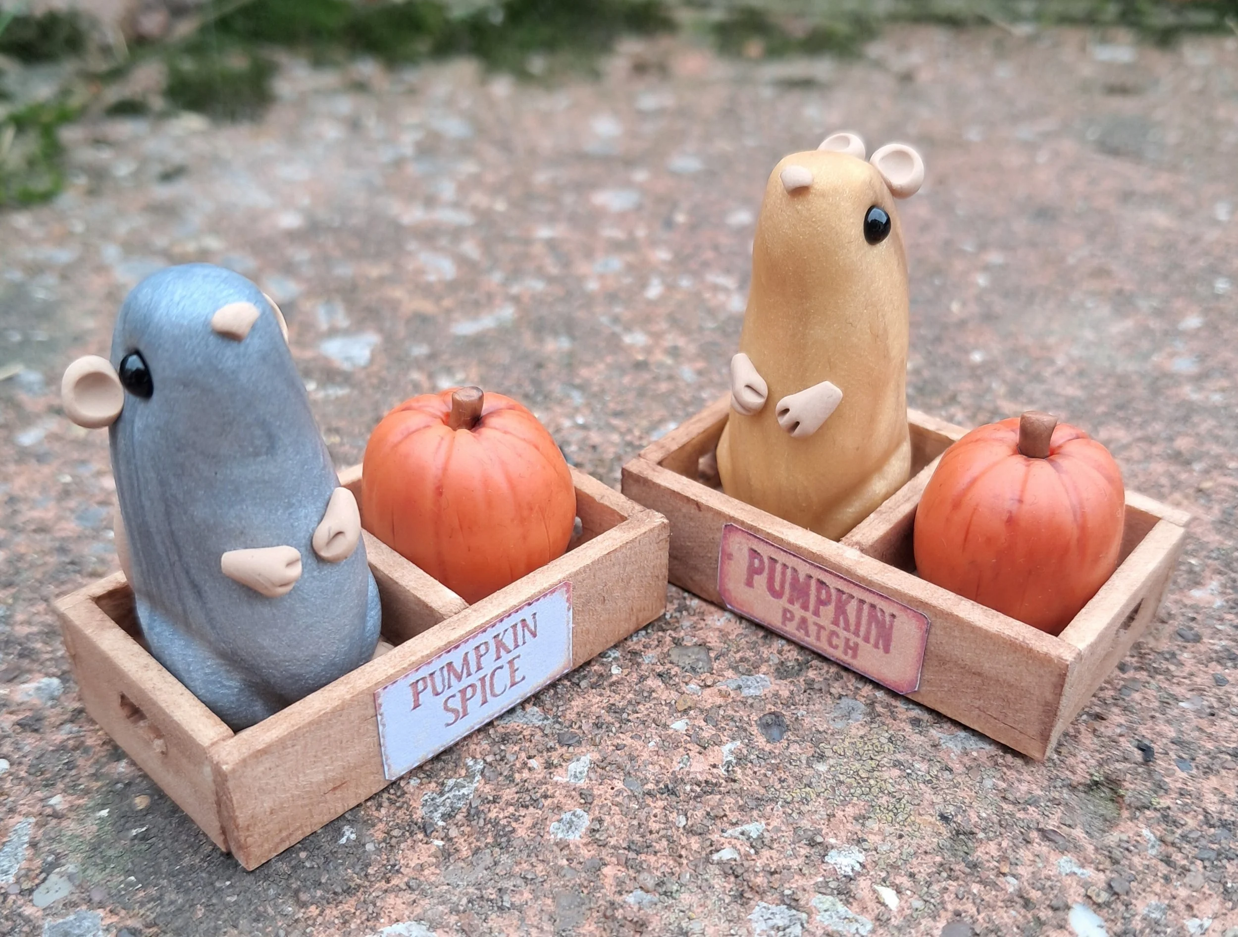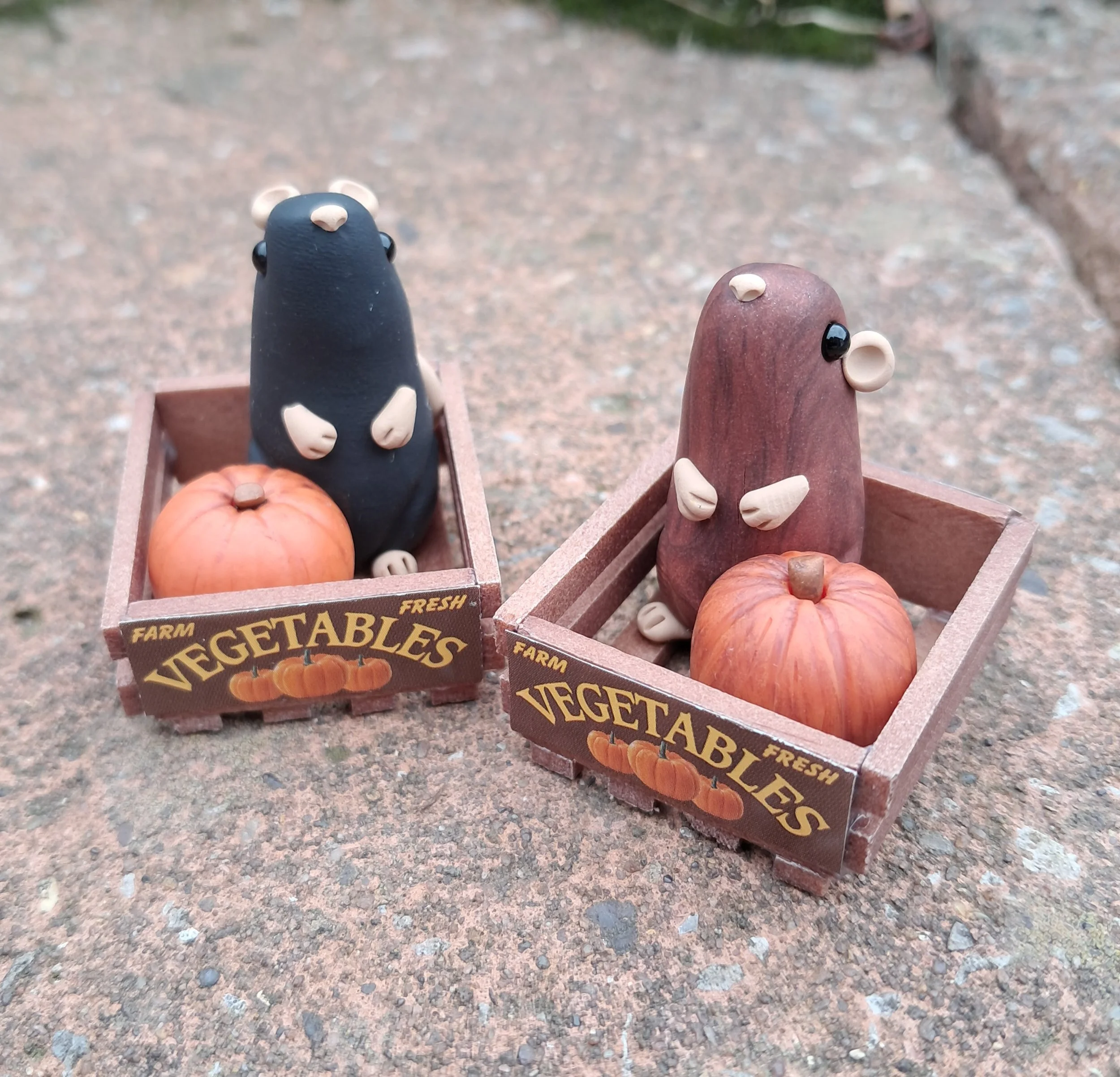 These little cuties each have a little wooden crate with a big juicy pumpkin nestled in it. All handmade from polymer clay. Pick your favourite from the menu.