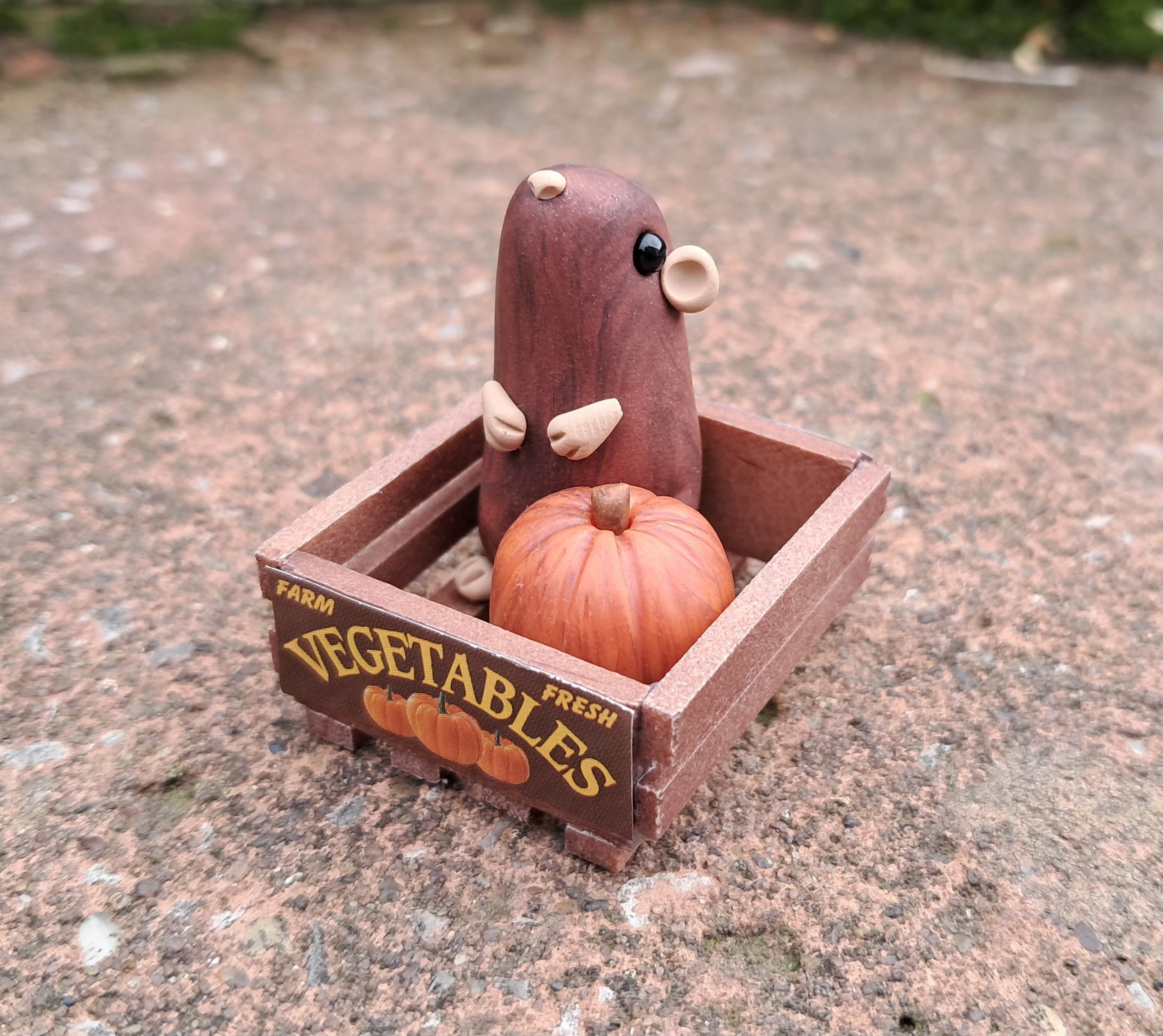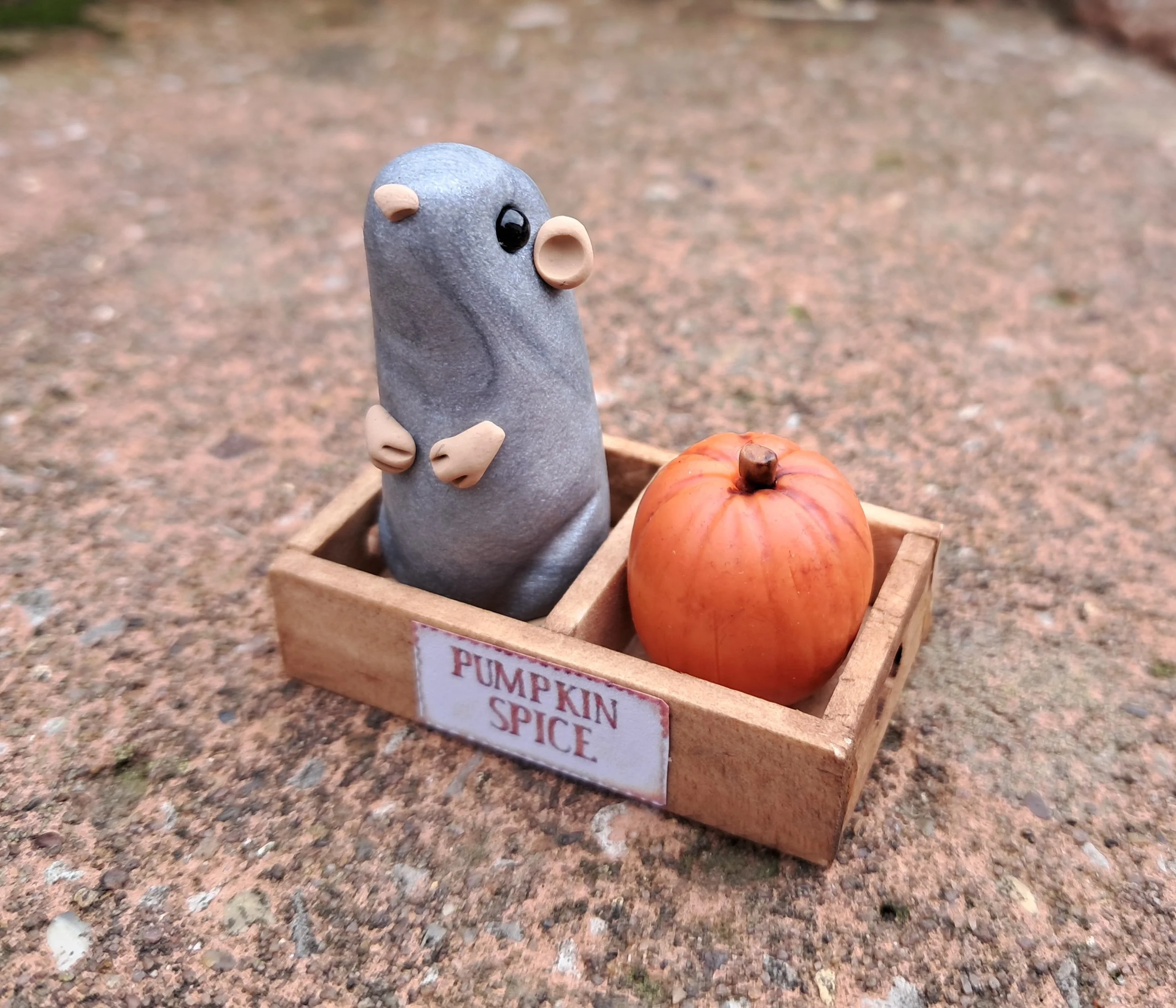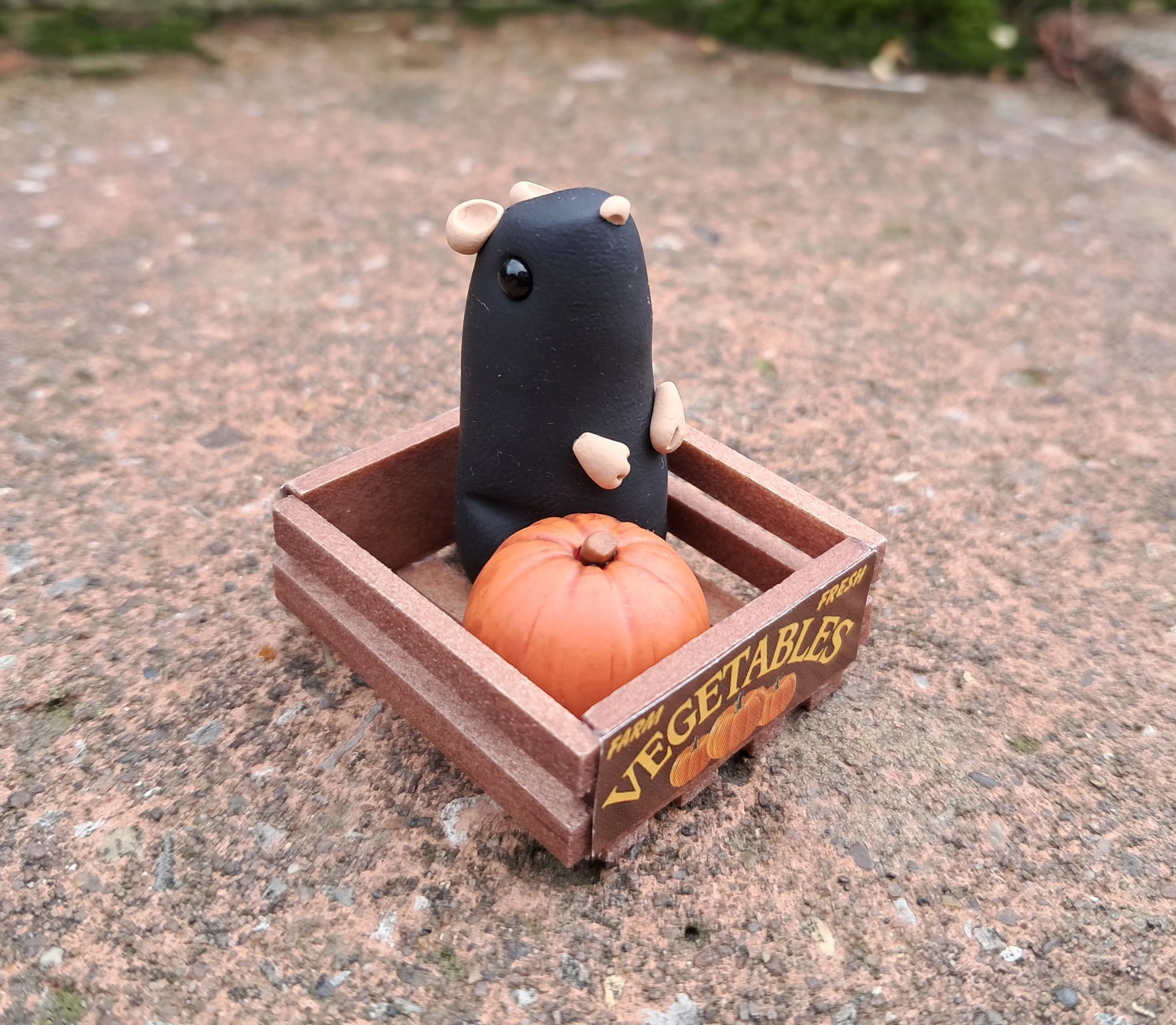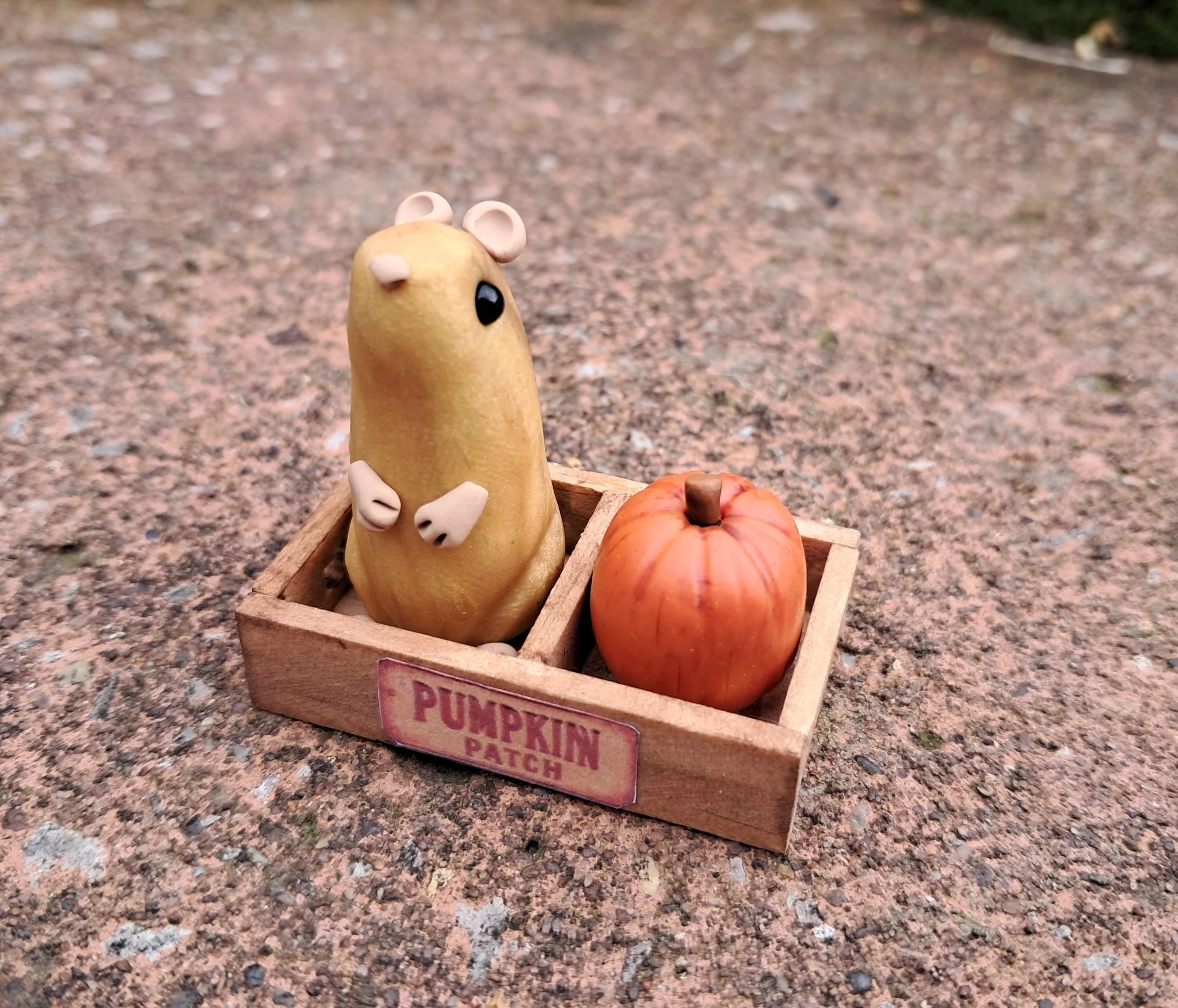 These little cuties each have a little wooden crate with a big juicy pumpkin nestled in it. All handmade from polymer clay. Pick your favourite from the menu.