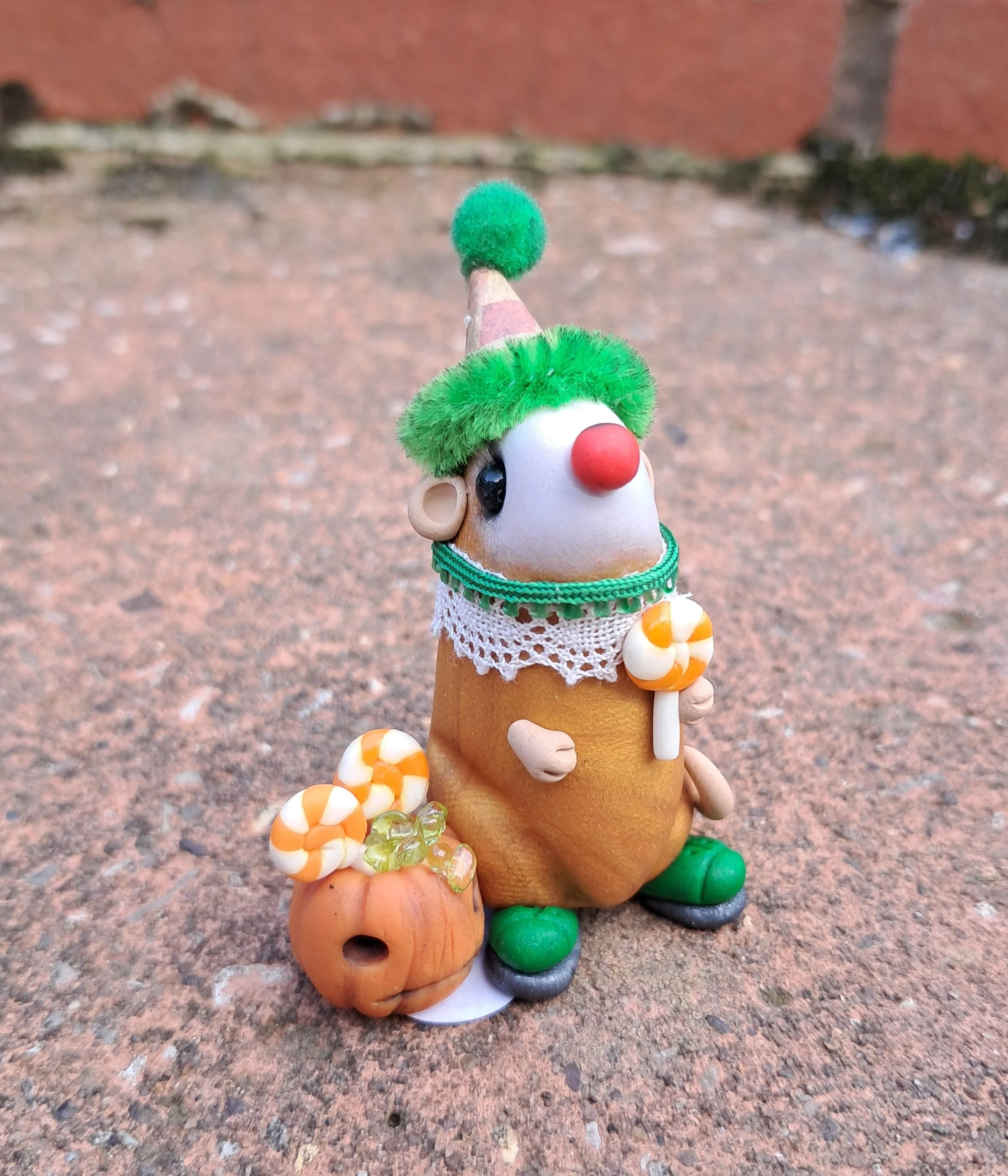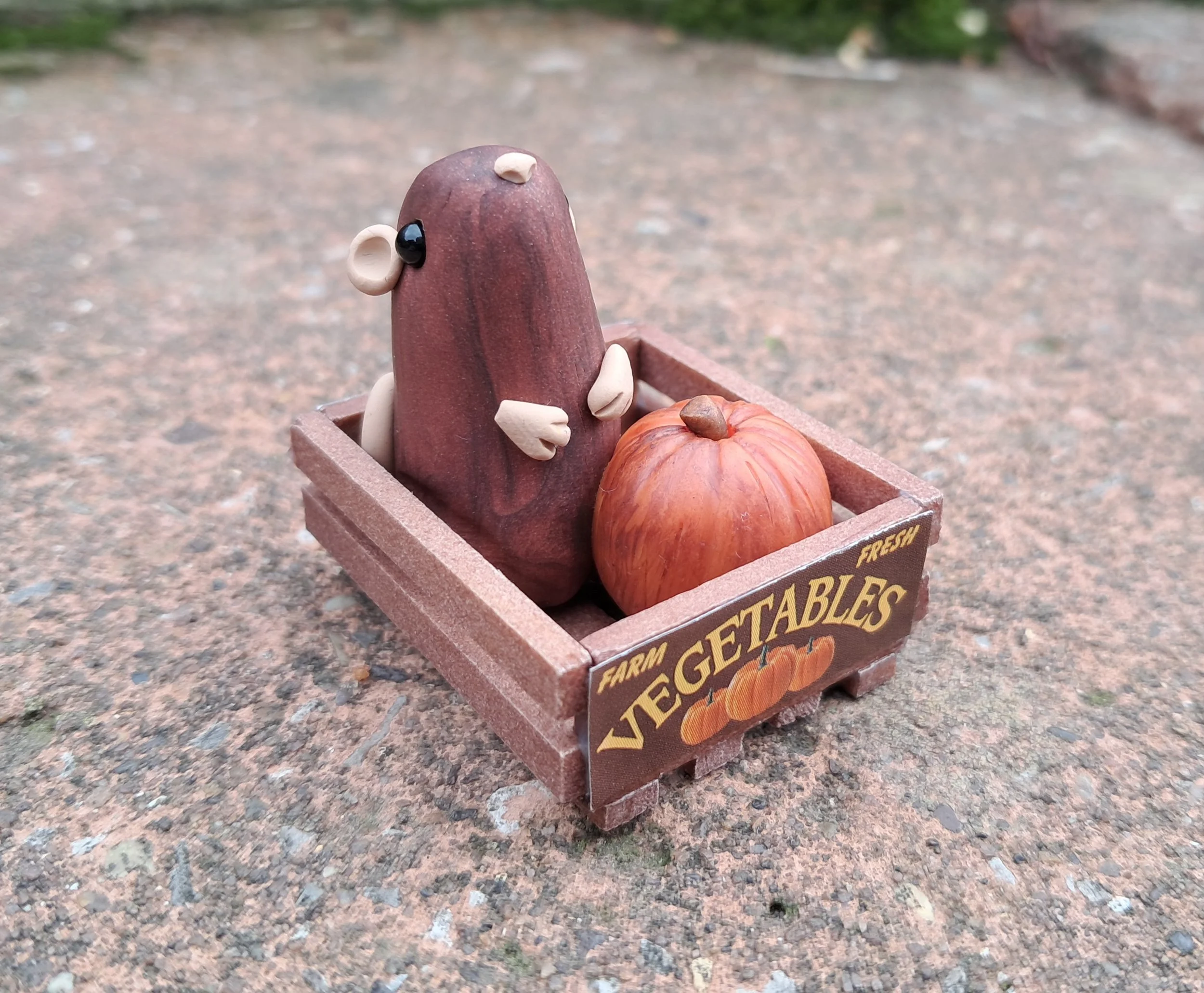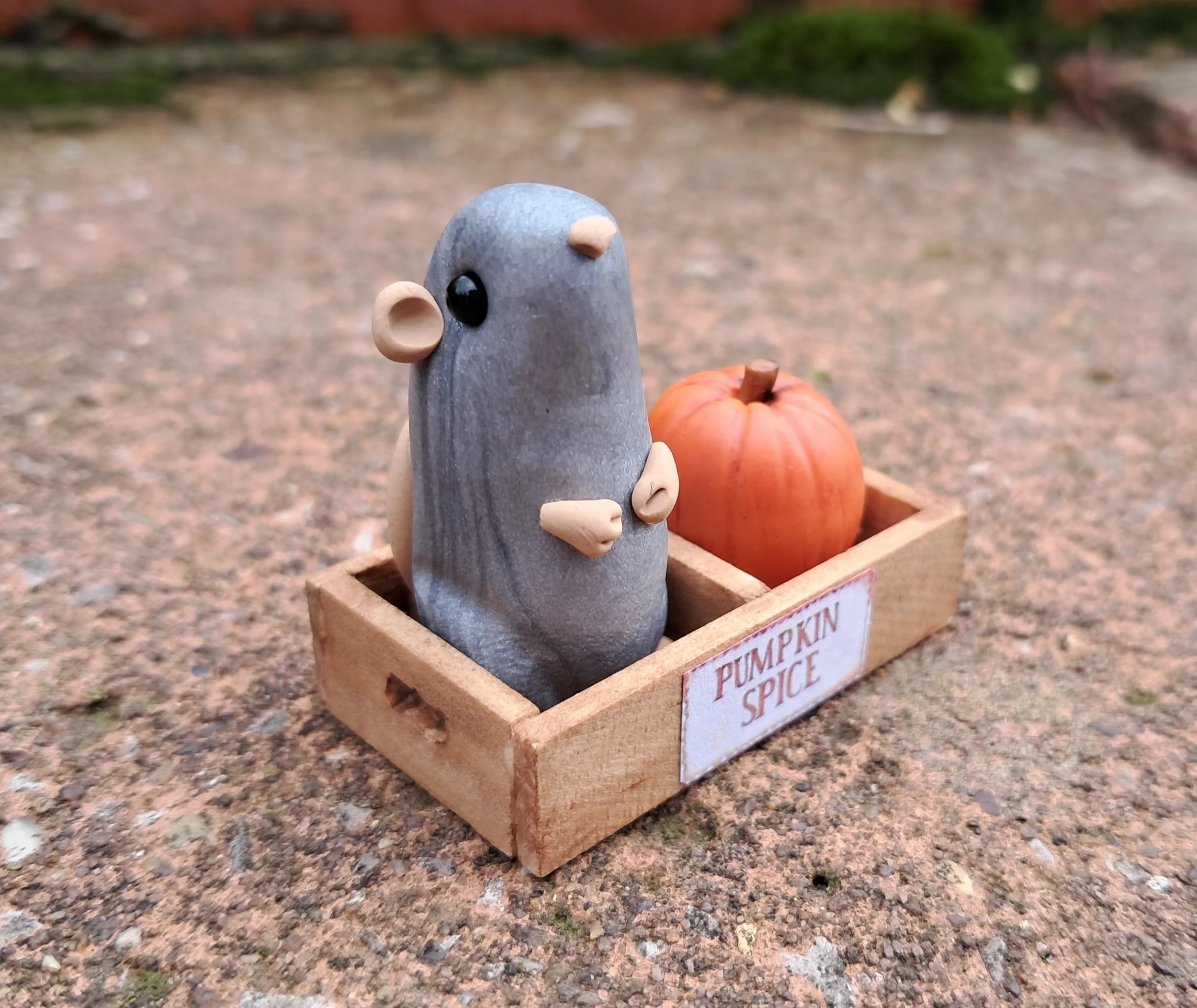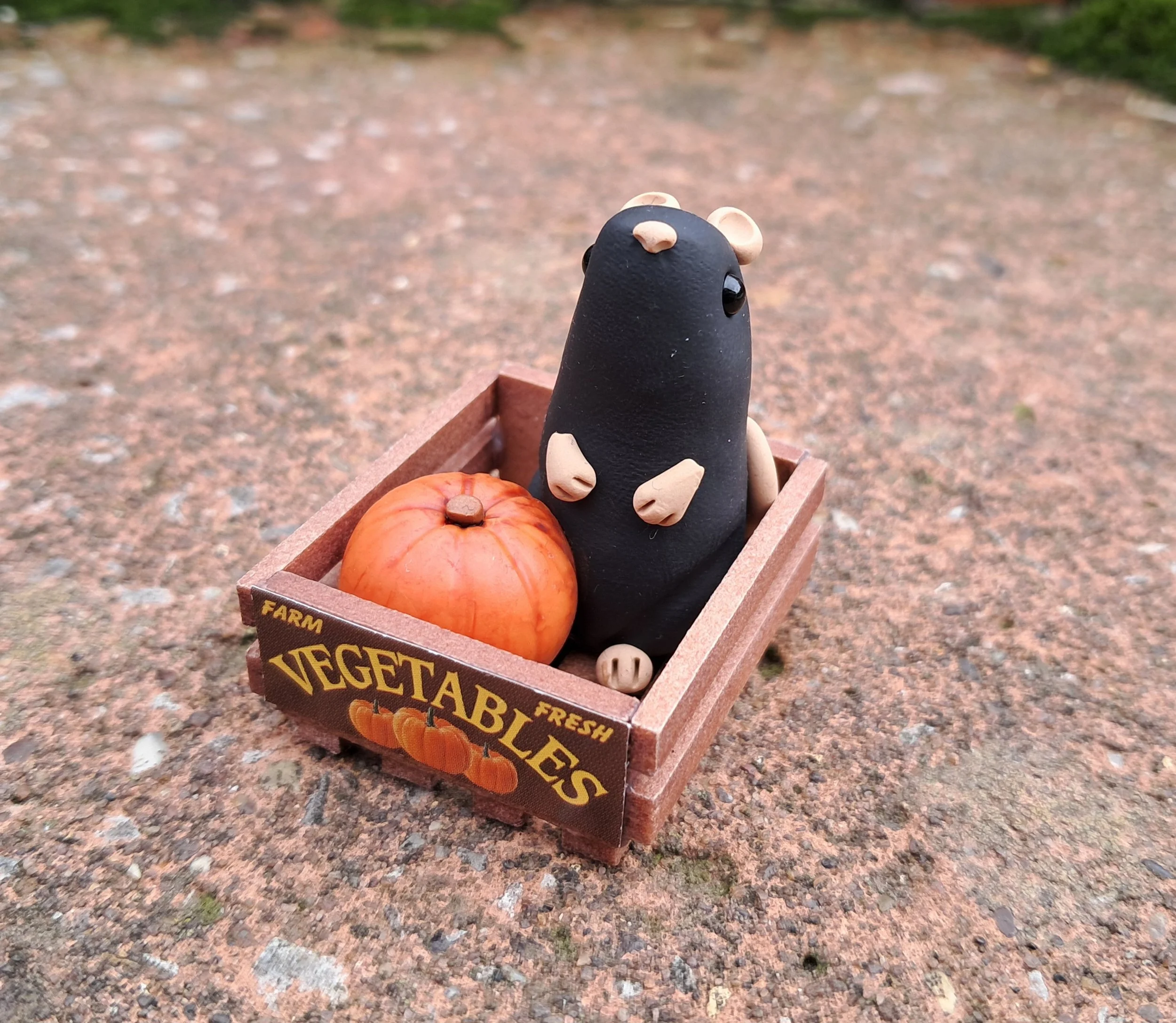 These little cuties each have a little wooden crate with a big juicy pumpkin nestled in it. All handmade from polymer clay. Pick your favourite from the menu.