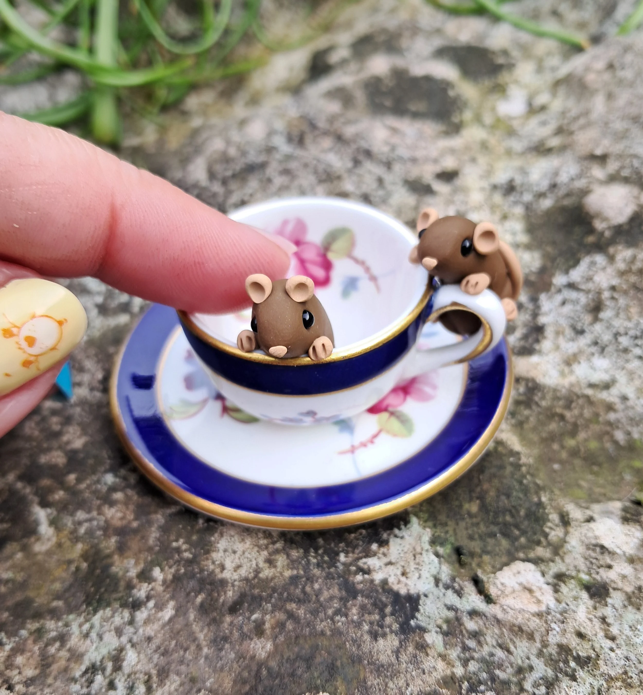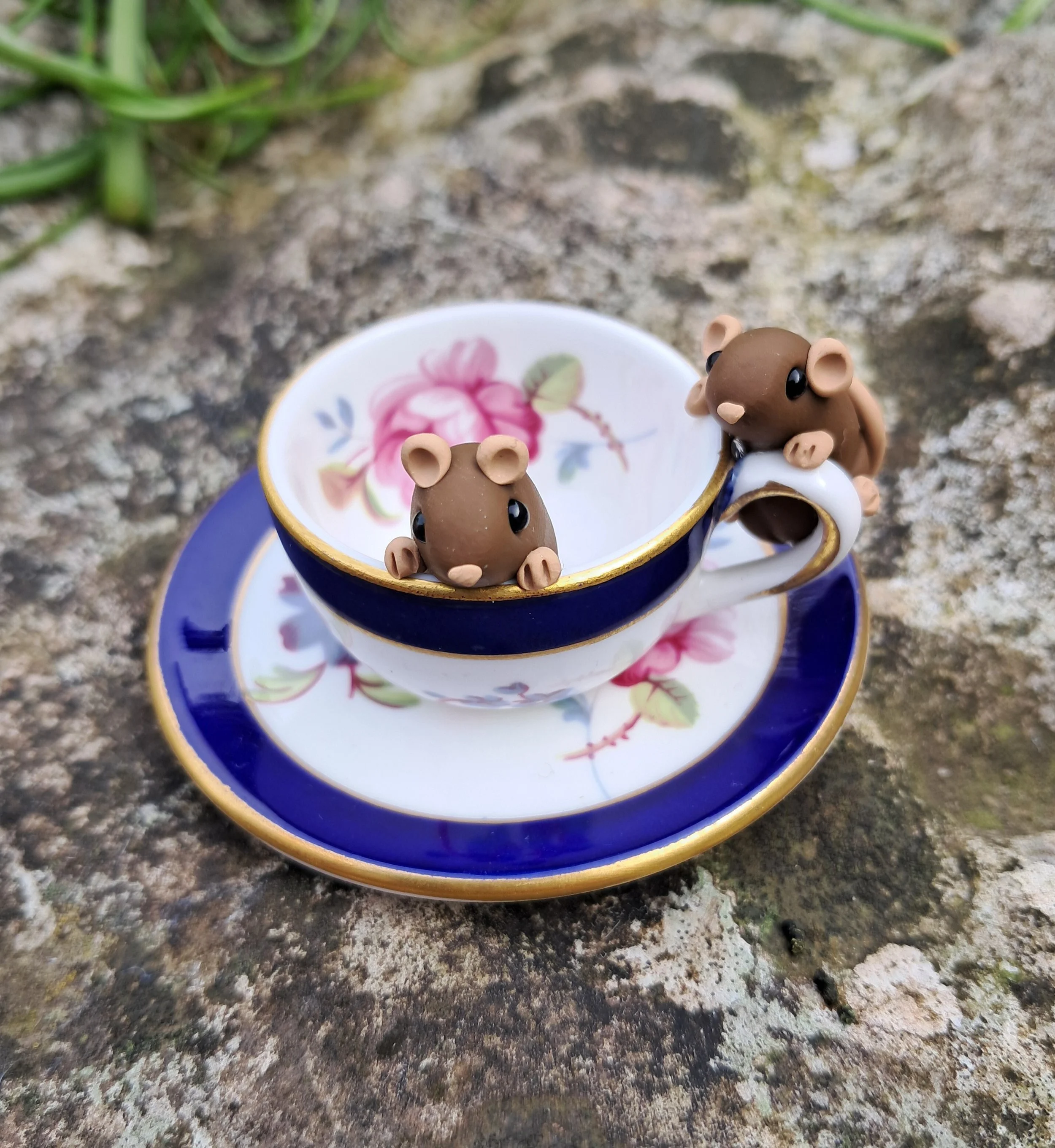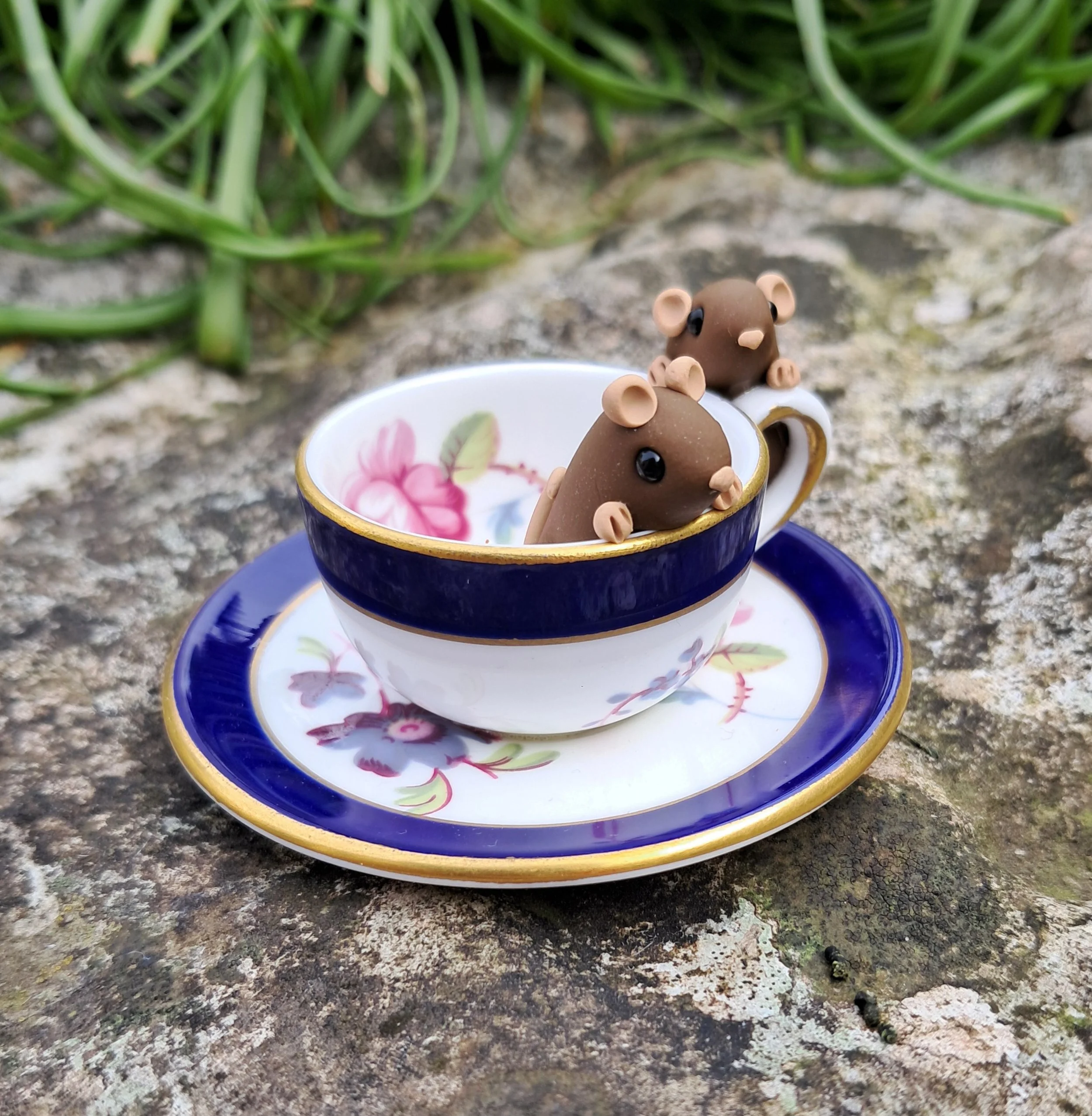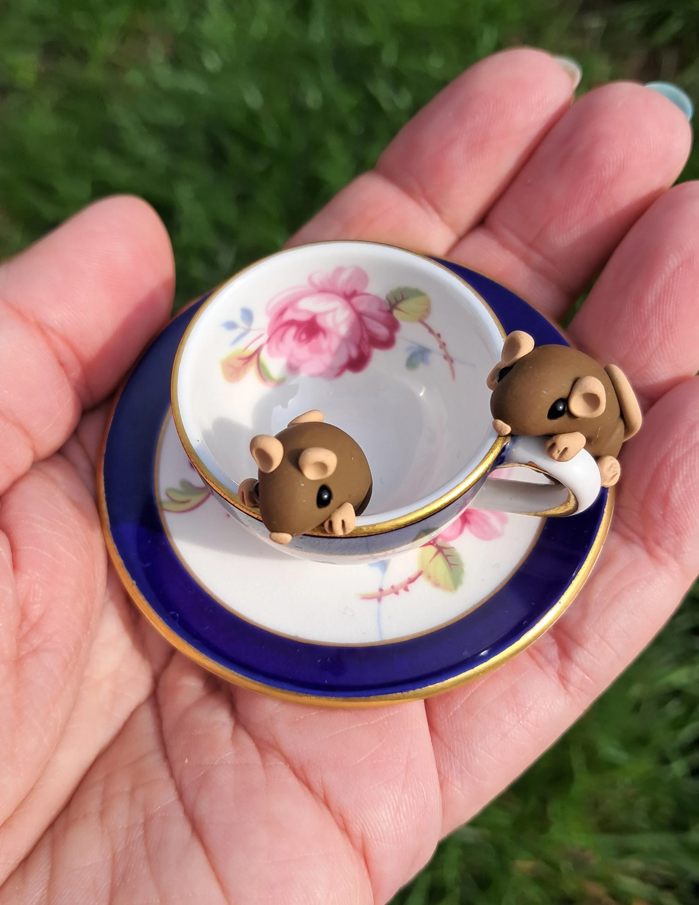 These adorable little one inch tall Macros are messing around in the most beautiful miniature coalport teacup.