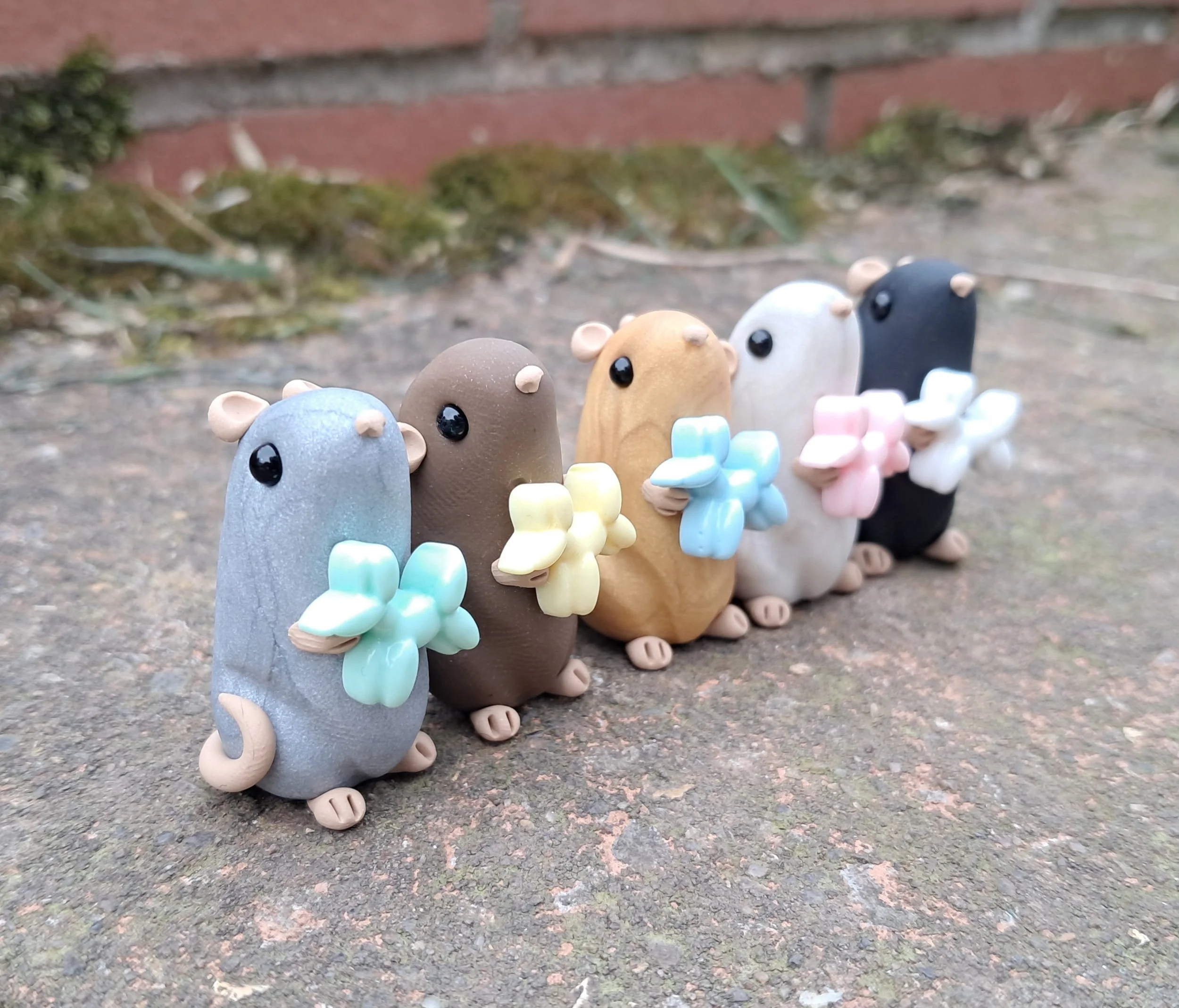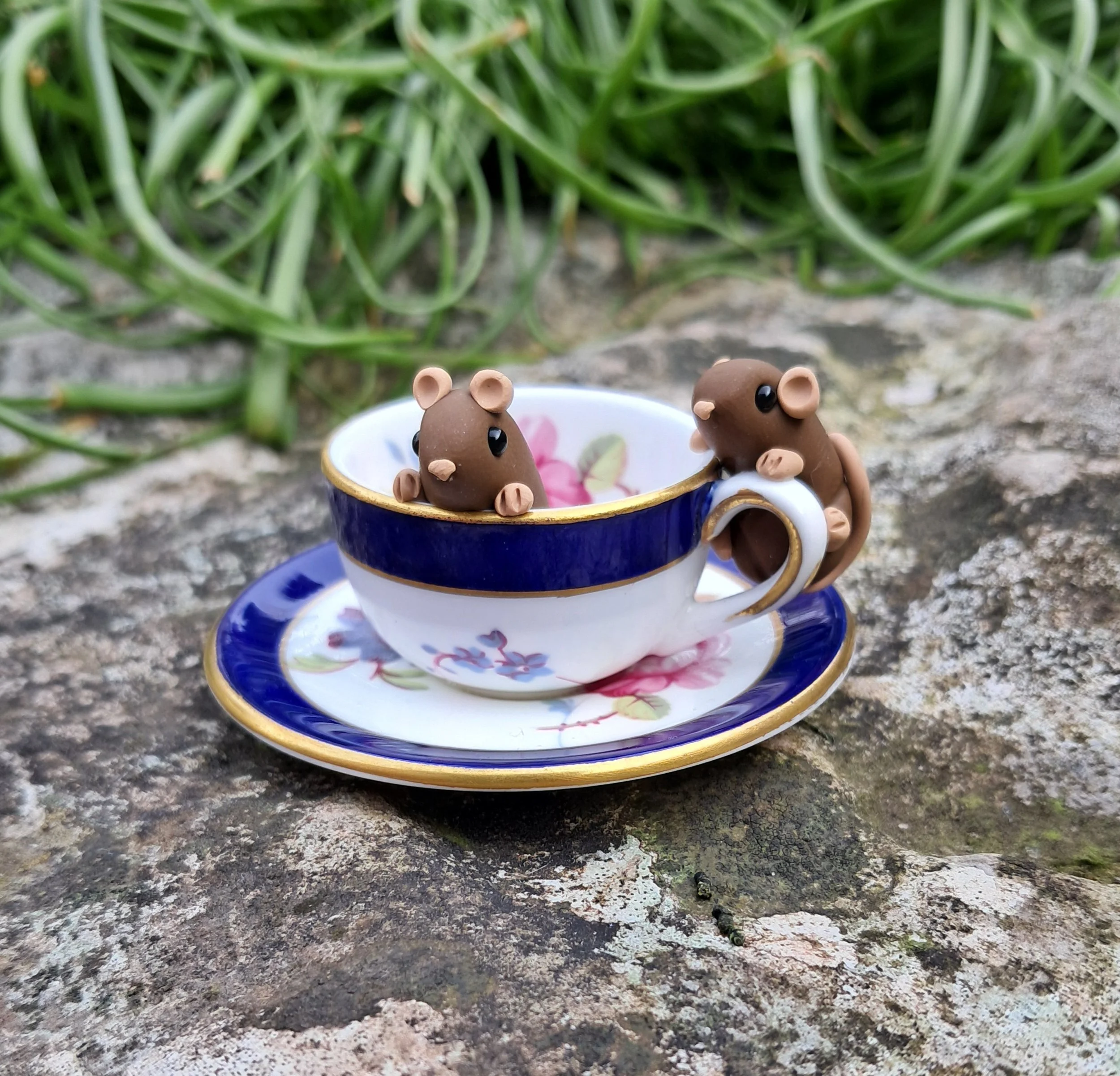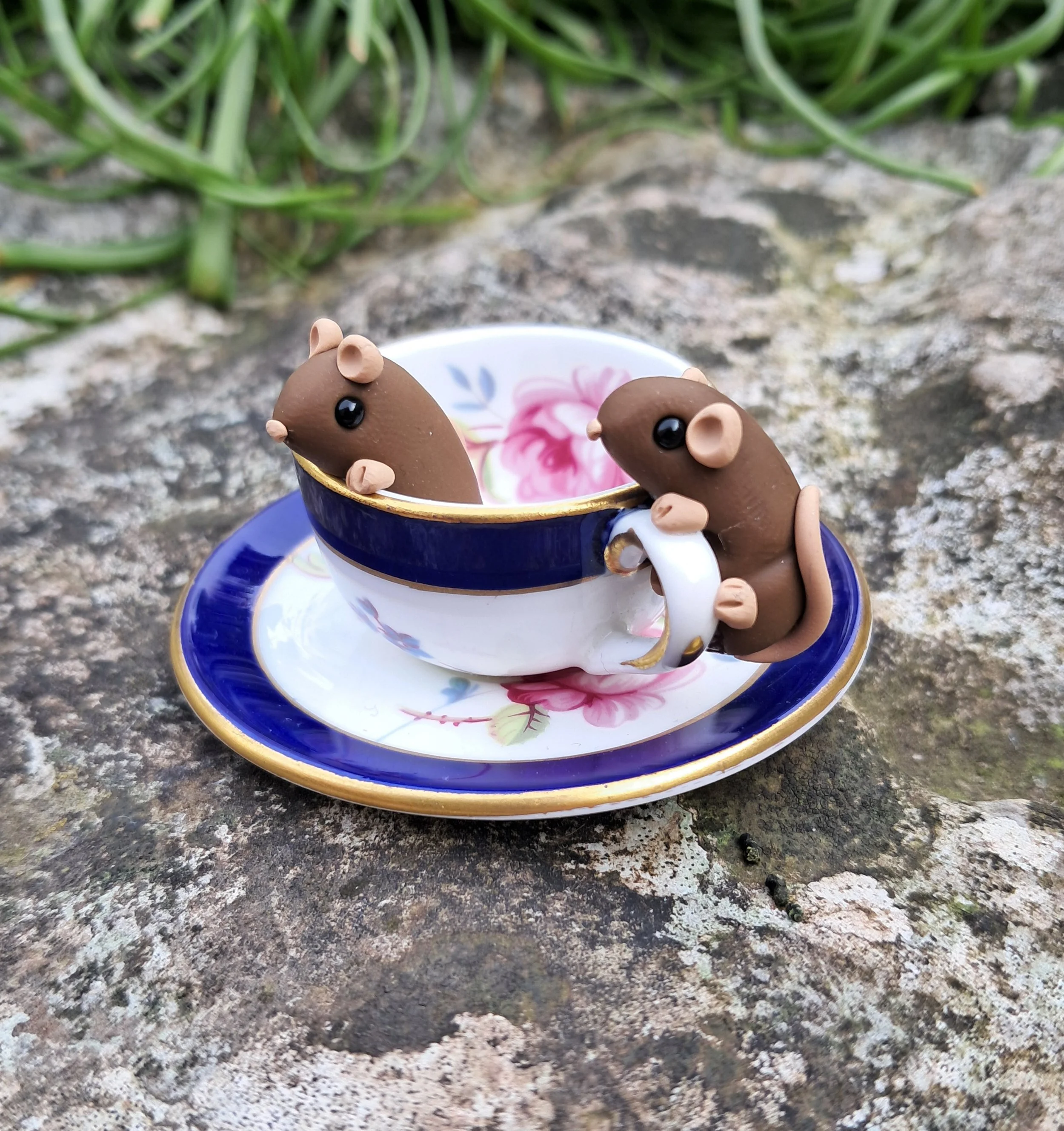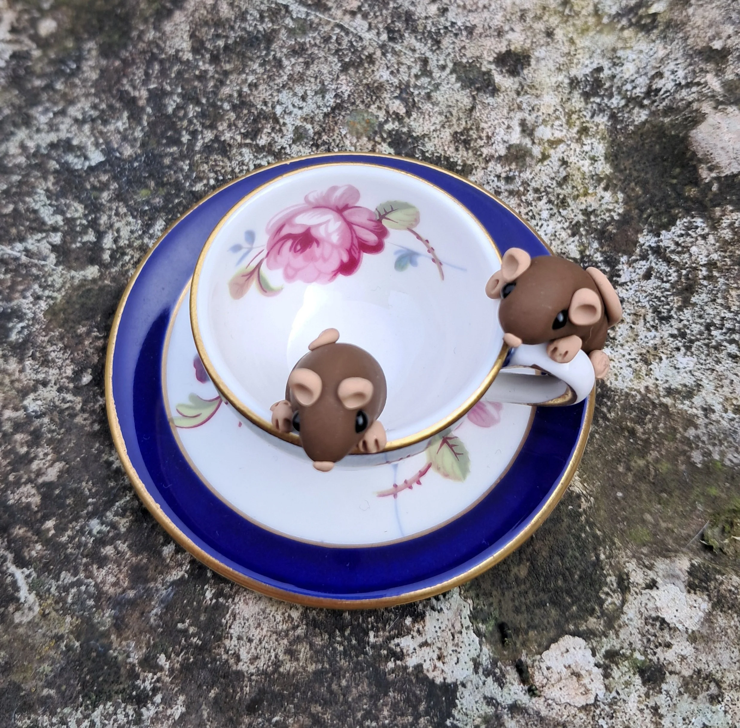 These adorable little one inch tall Macros are messing around in the most beautiful miniature coalport teacup.