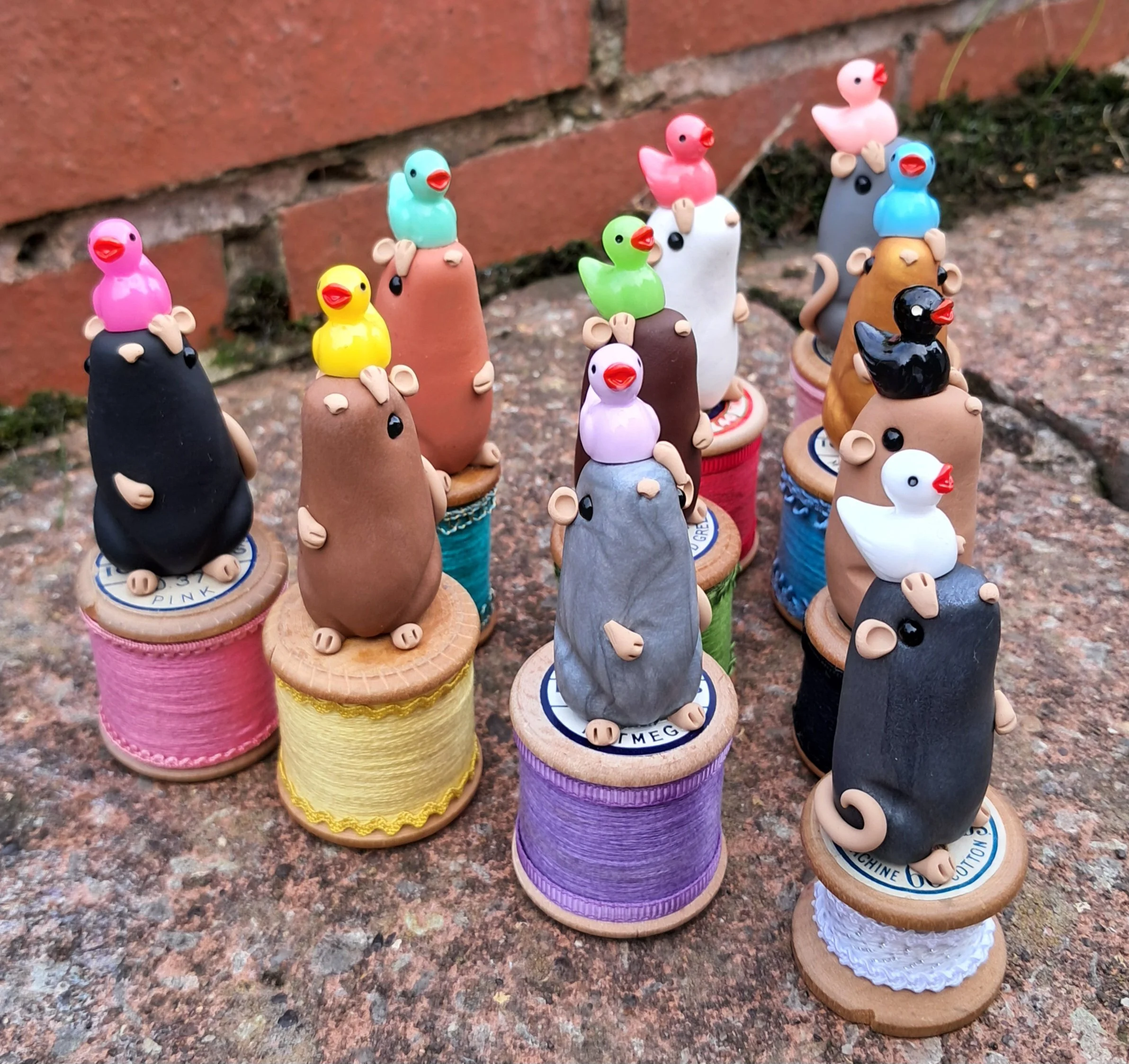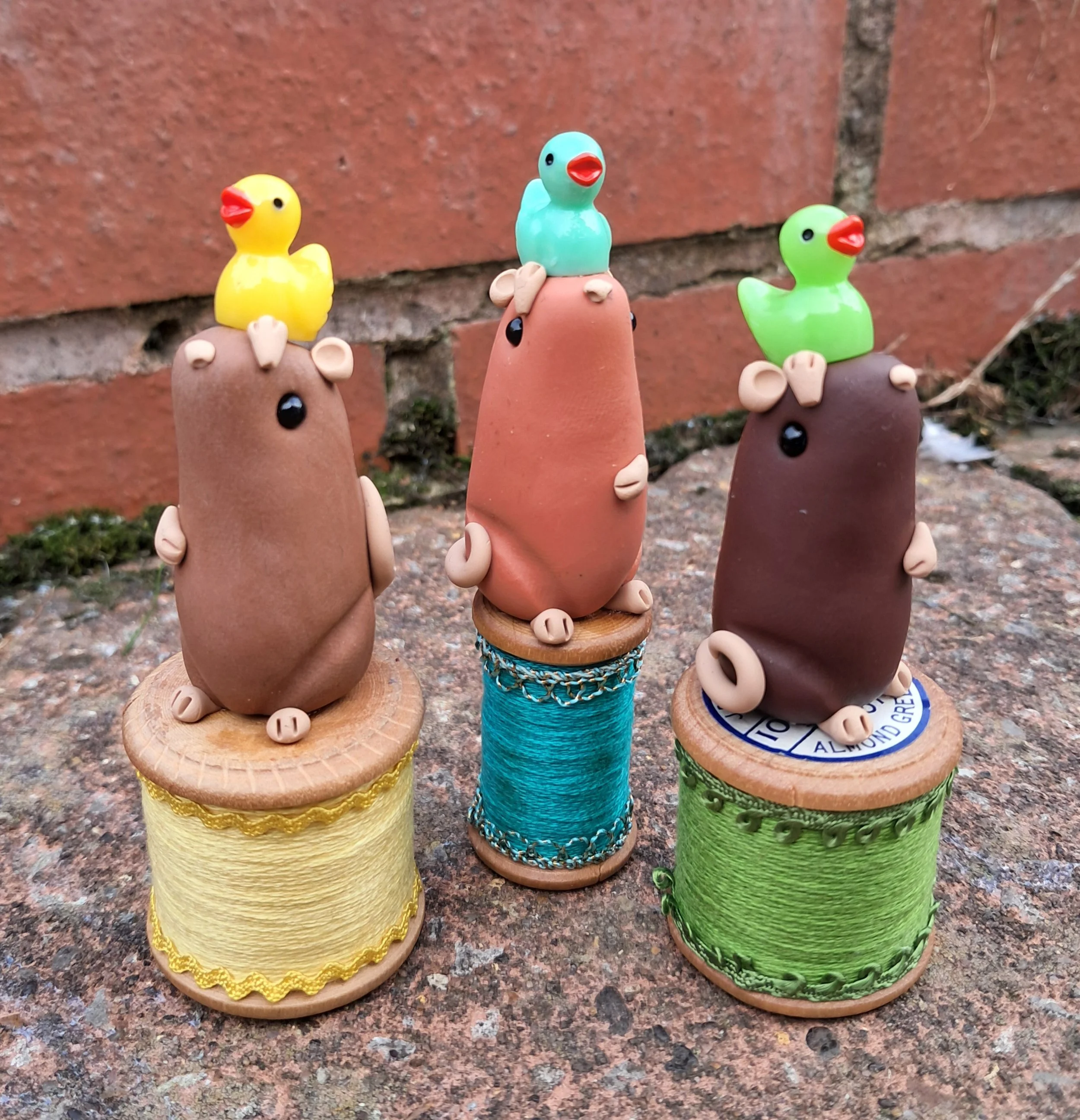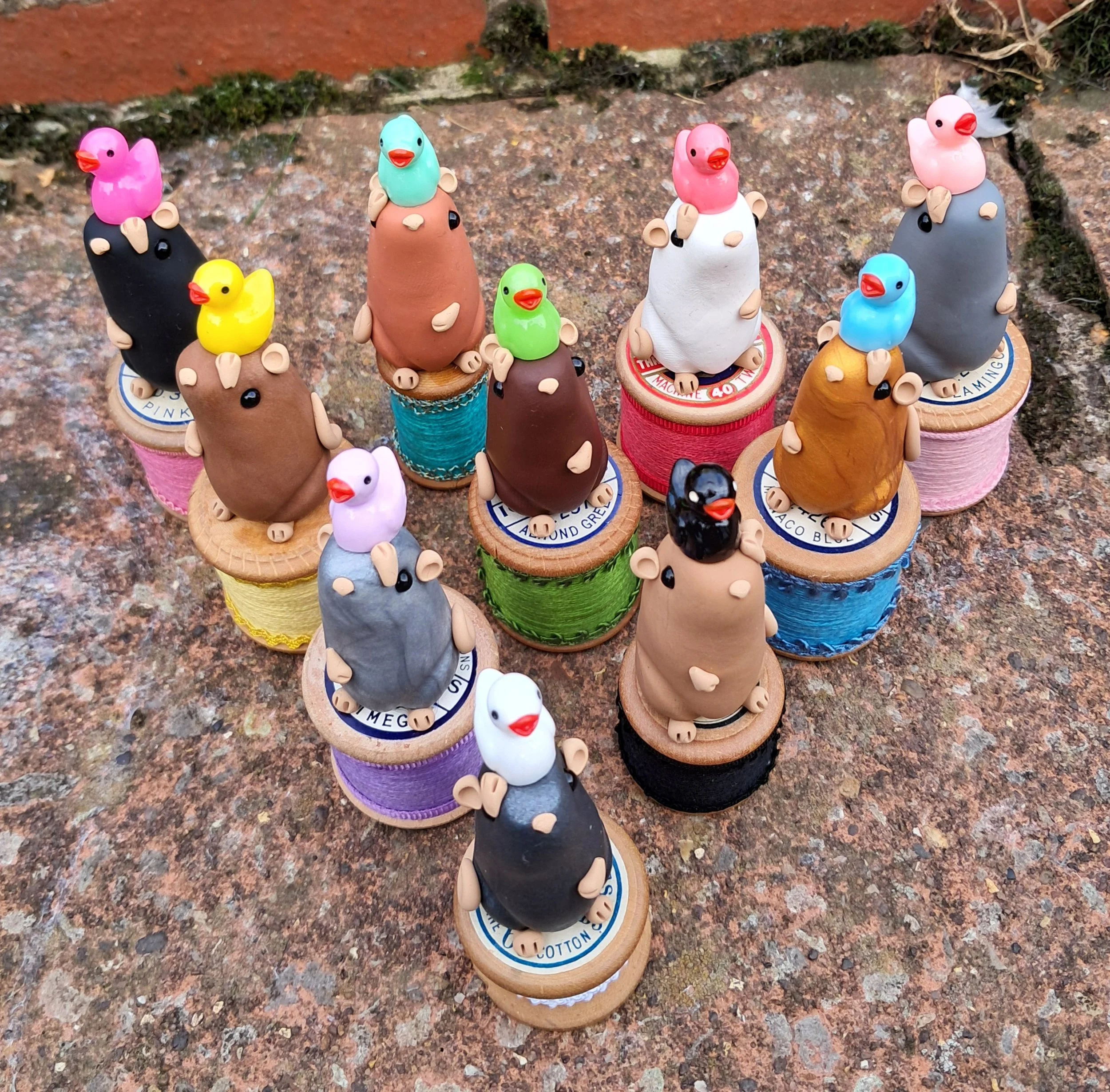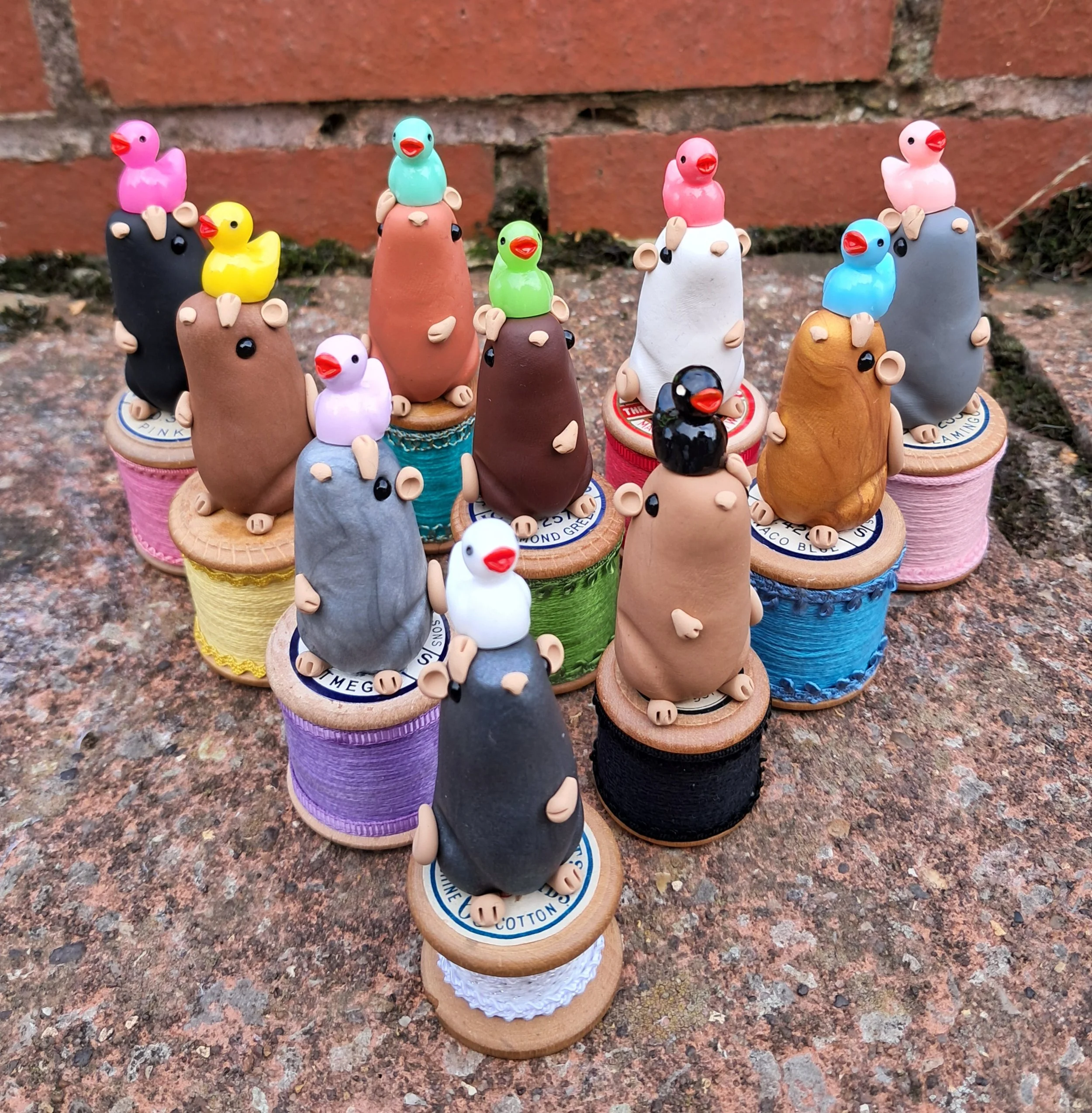 Each Mini sits upon a vintage wooden cotton reel in their favourite colour and has a cute matching ducky friend perched on their head. Choose your favourite from the menu.