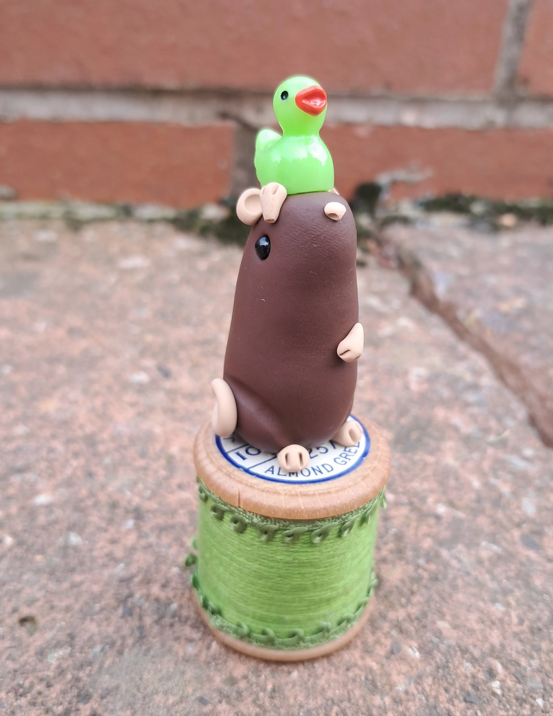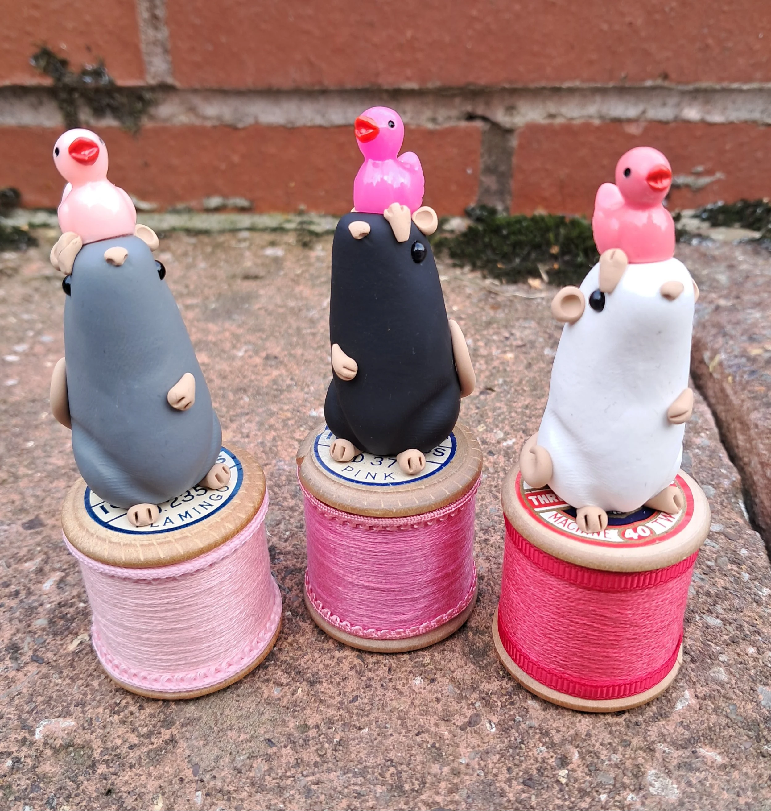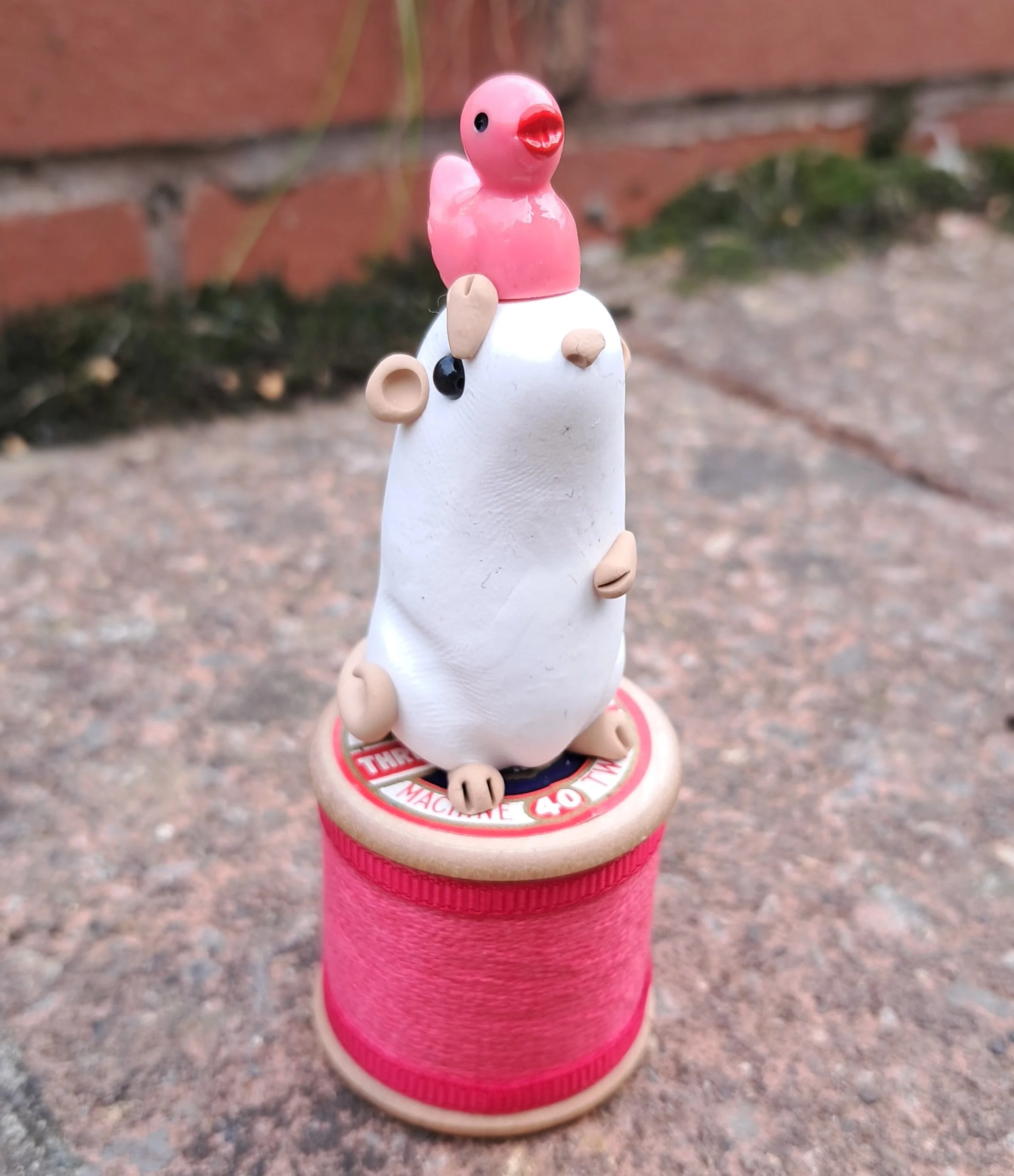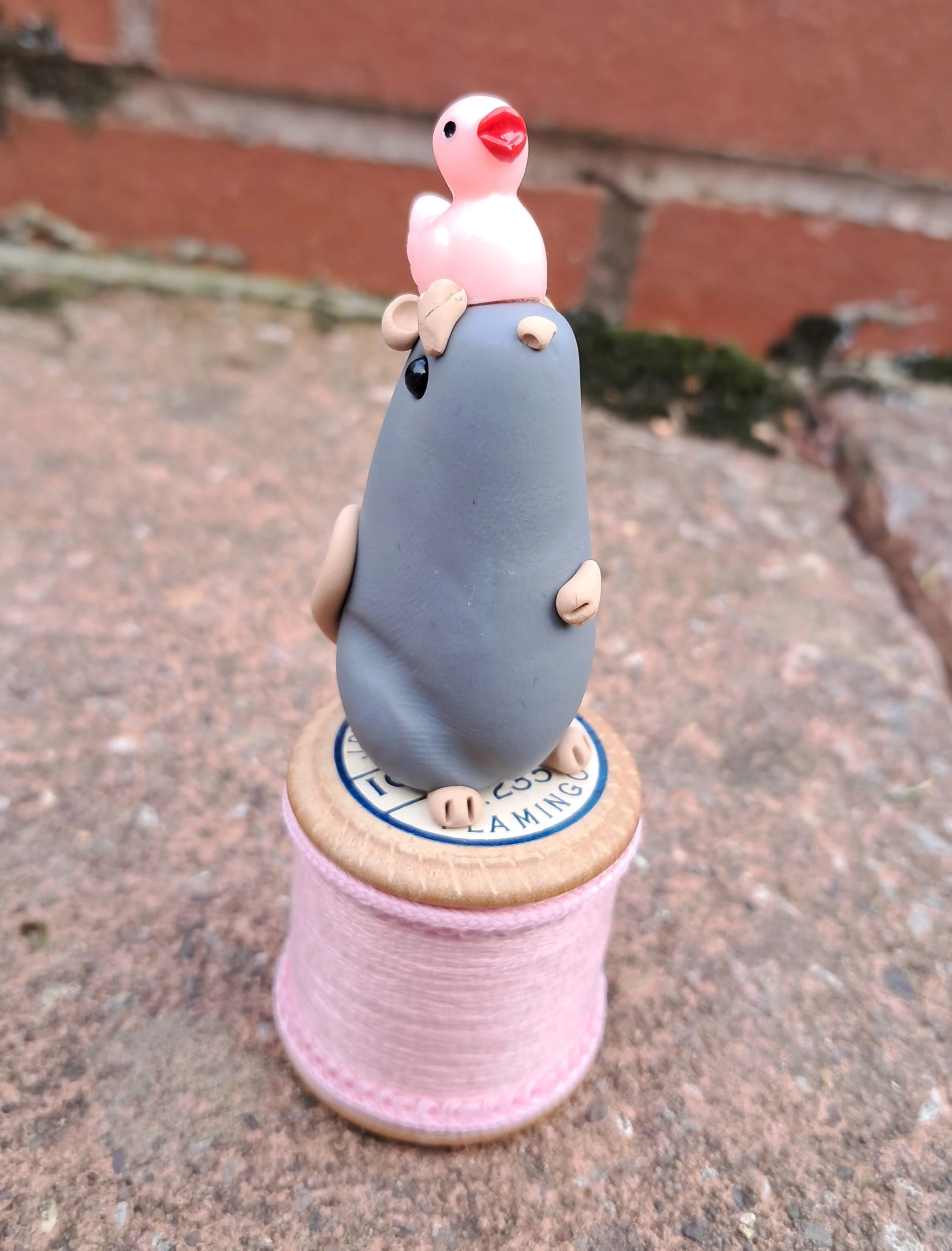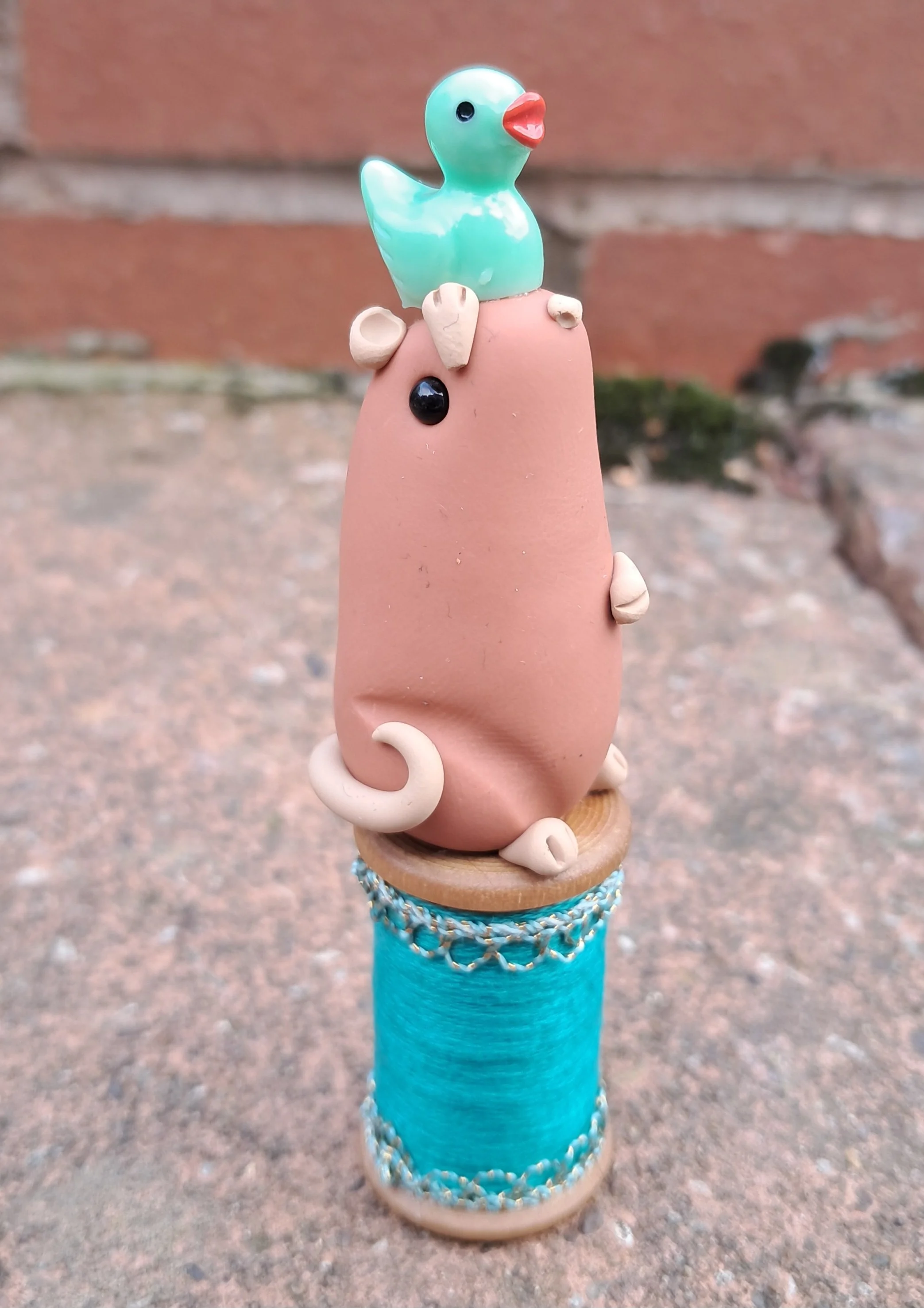 Each Mini sits upon a vintage wooden cotton reel in their favourite colour and has a cute matching ducky friend perched on their head. Choose your favourite from the menu.