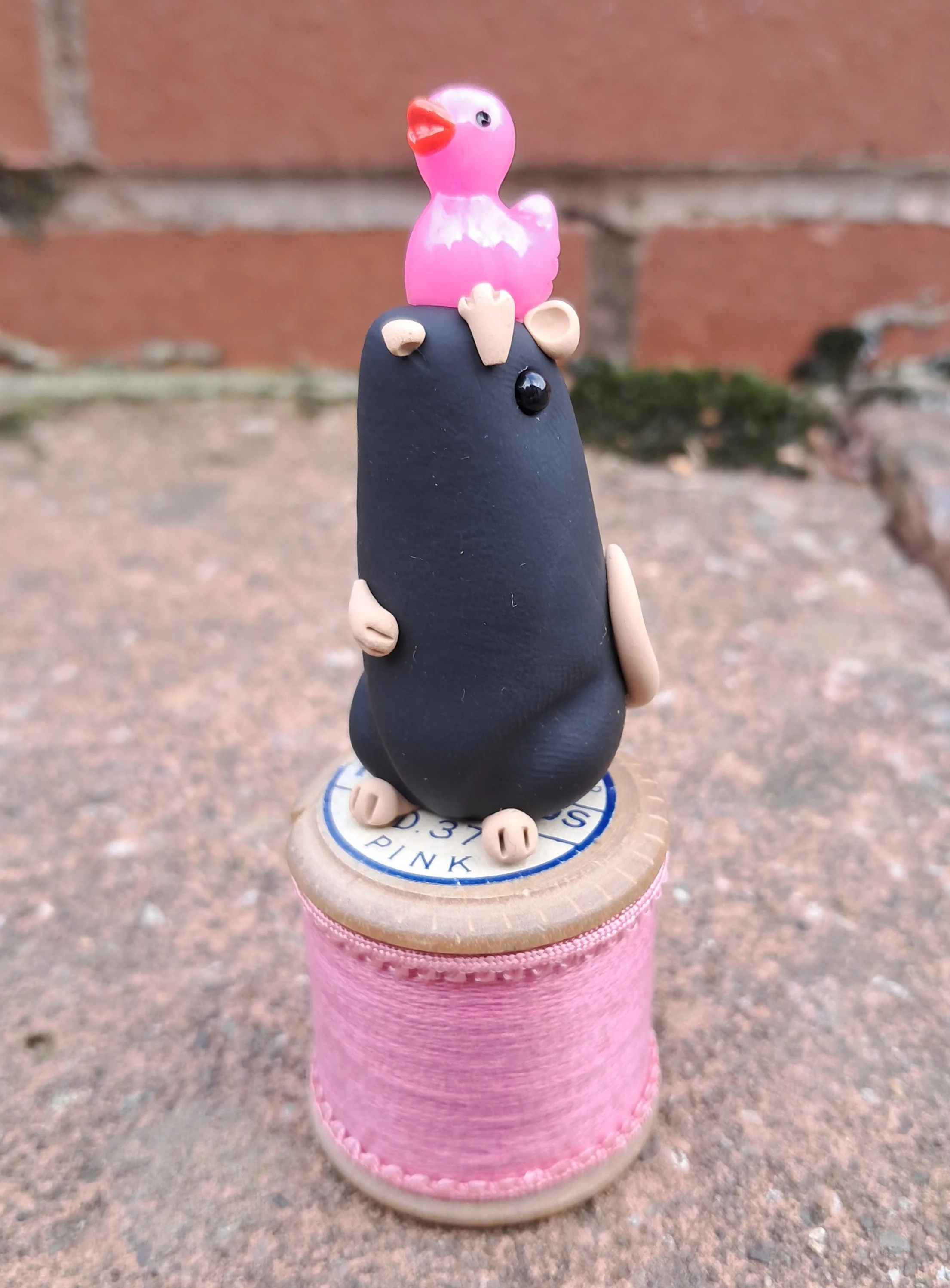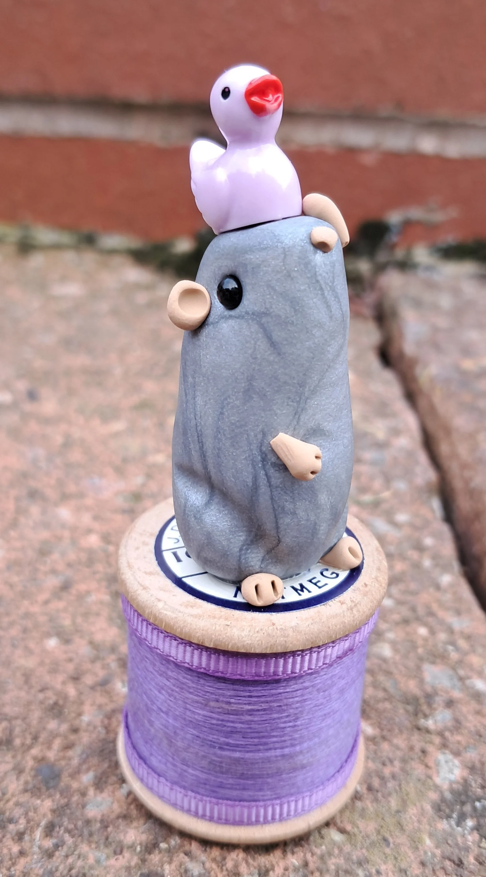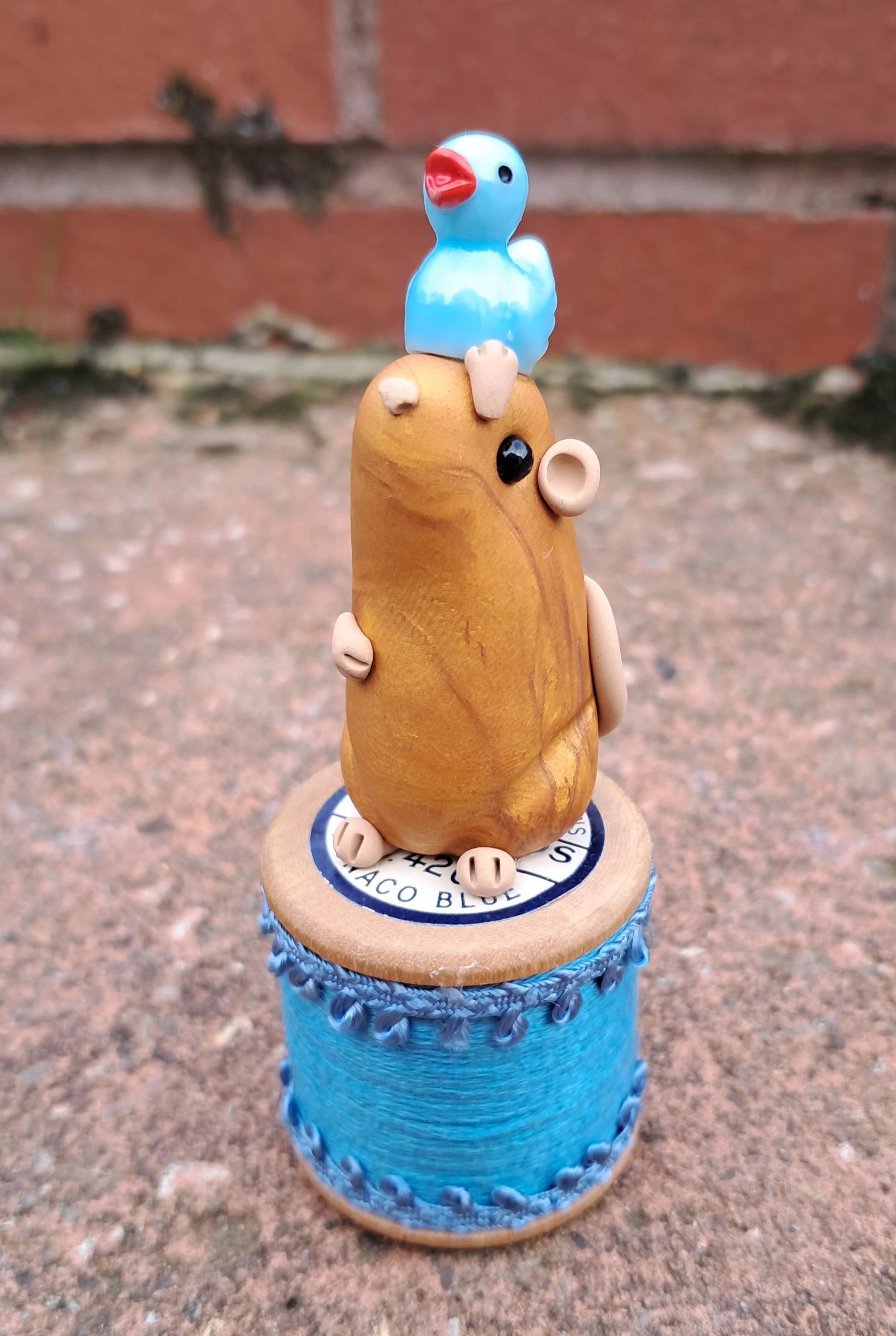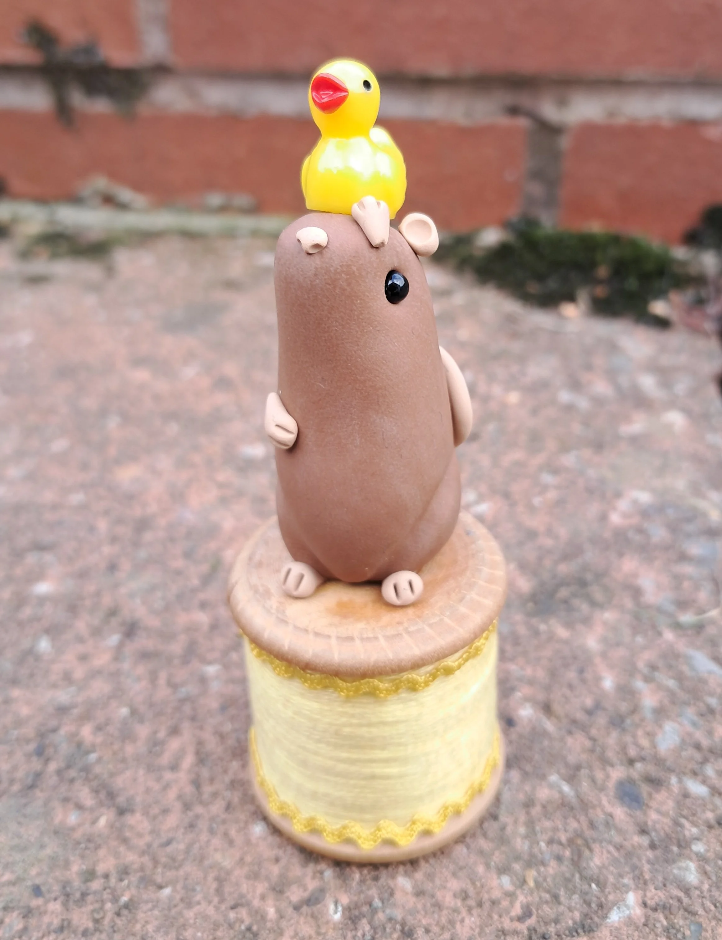 Each Mini sits upon a vintage wooden cotton reel in their favourite colour and has a cute matching ducky friend perched on their head. Choose your favourite from the menu.