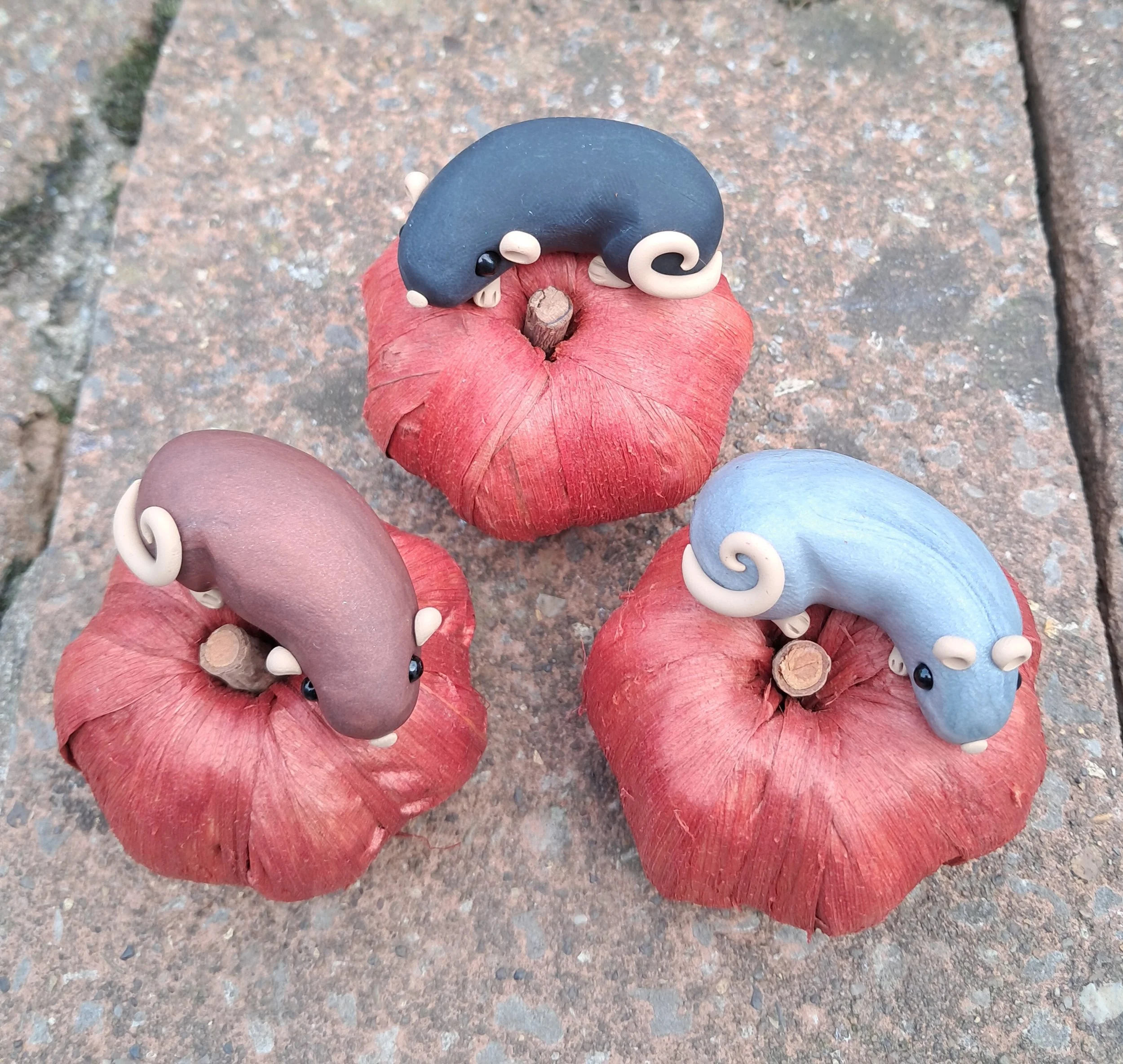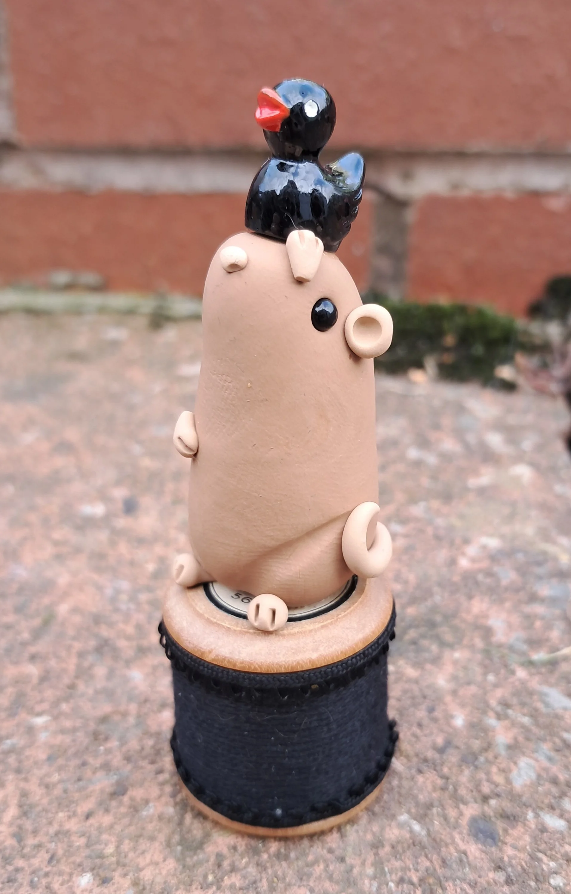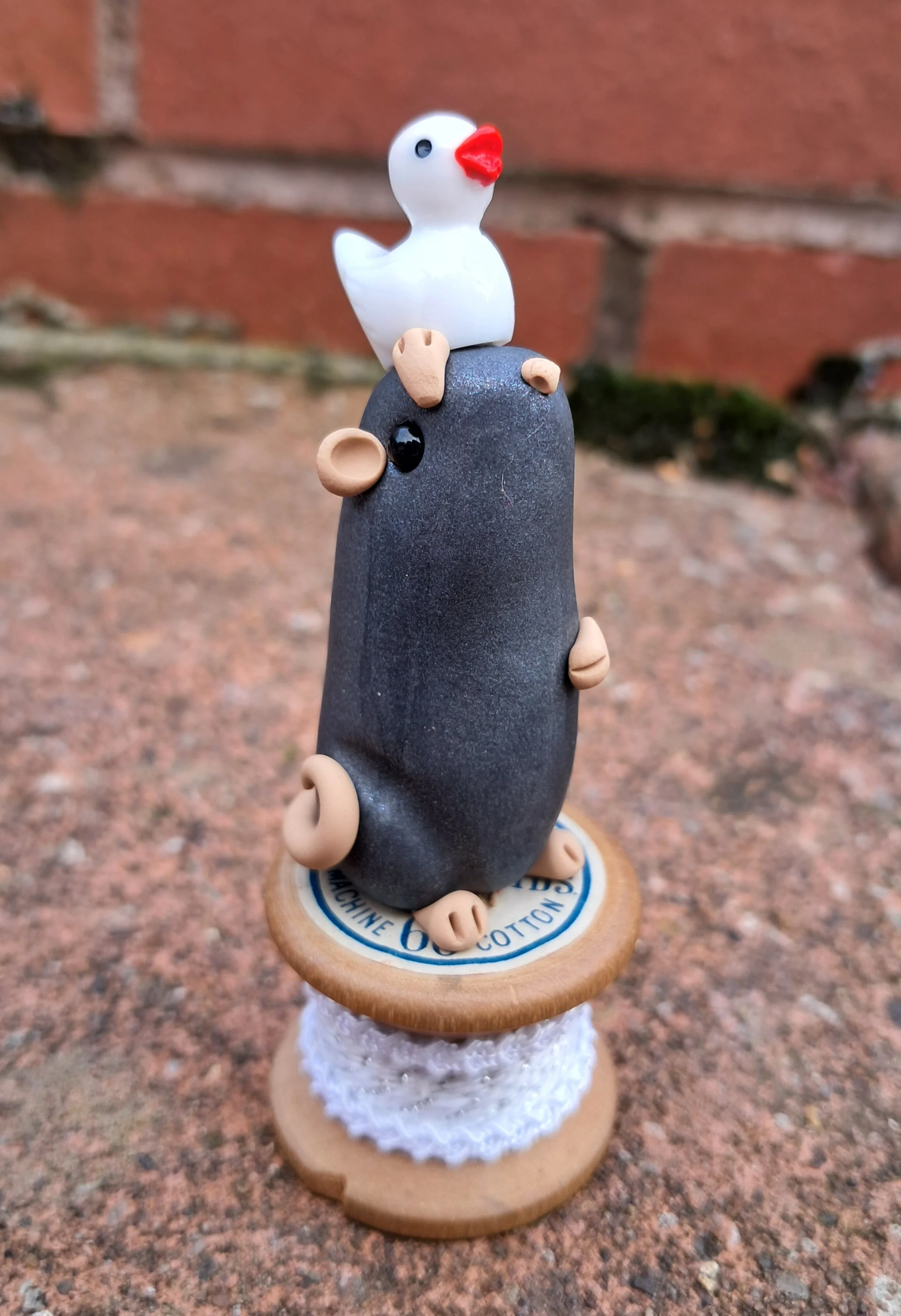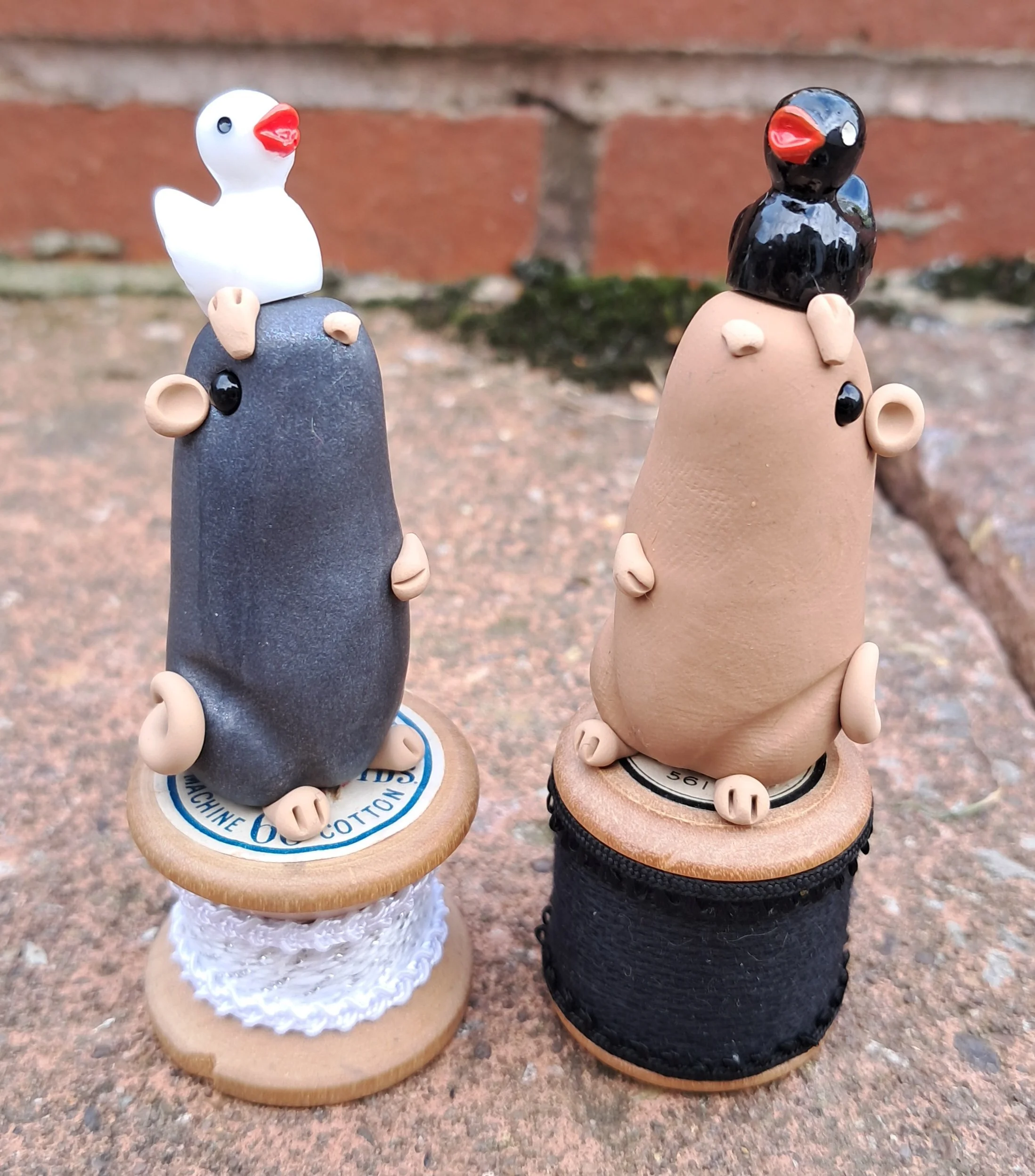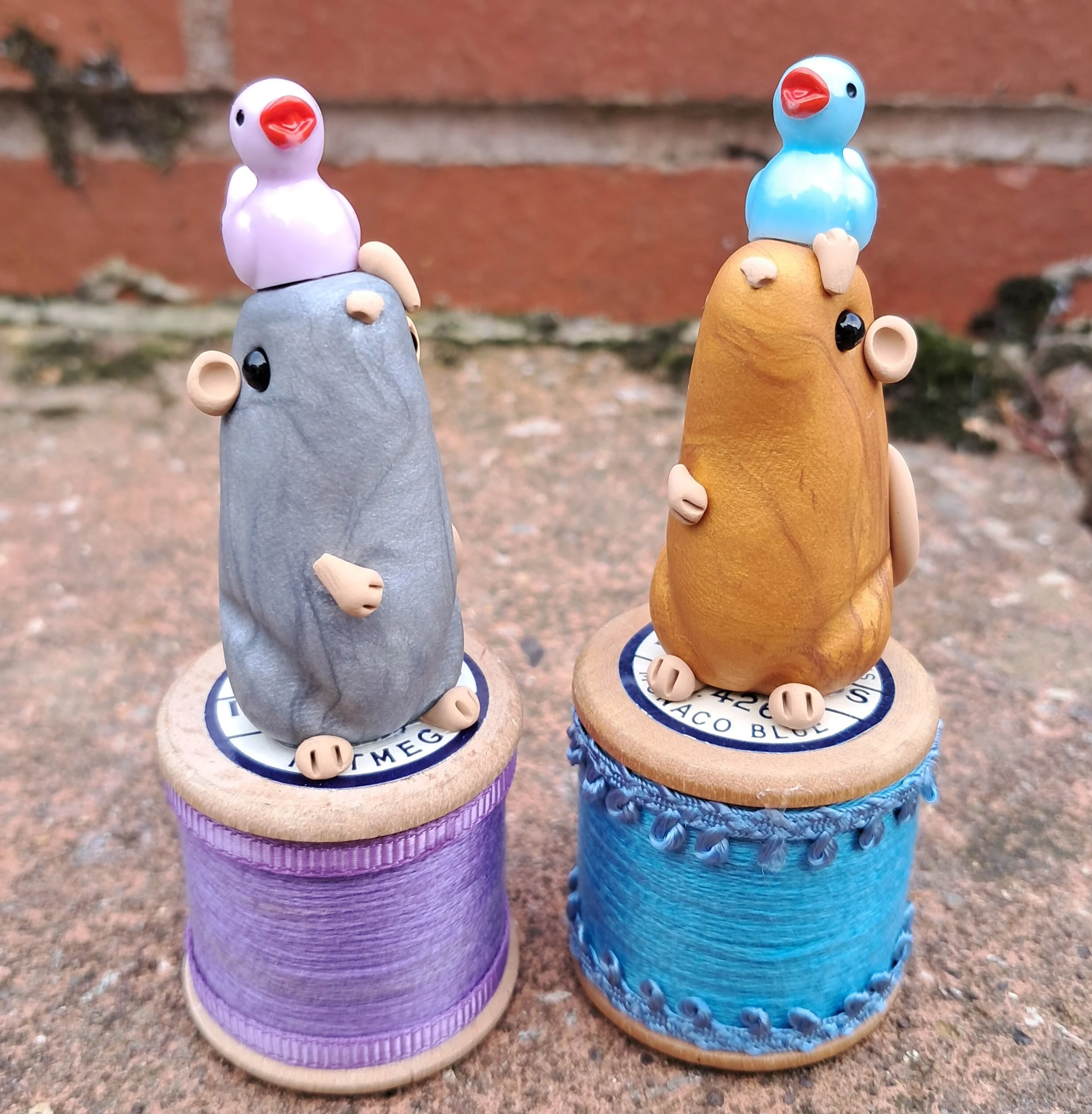 Each Mini sits upon a vintage wooden cotton reel in their favourite colour and has a cute matching ducky friend perched on their head. Choose your favourite from the menu.