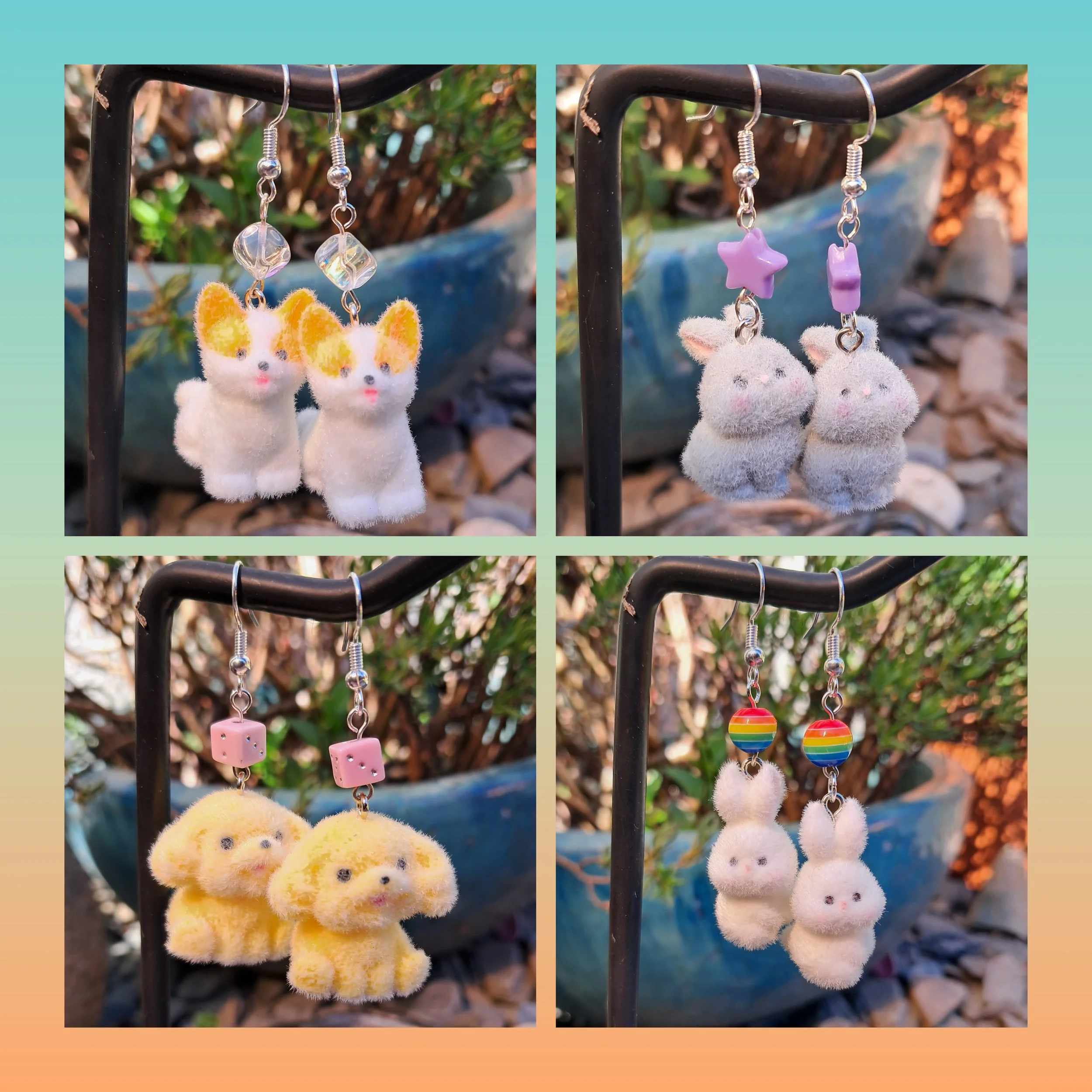 Hand made earrings. Each pair are unique and feature a fuzzy animal and a complimentary pretty bead. Hung from silver plated ear hooks. These are far from dainty but they are quite lightweight so very easy to wear. Perfect to help you stand out from the crowd. This weeks offerings are bunnies and puppies. They will come in an organza gift bag.