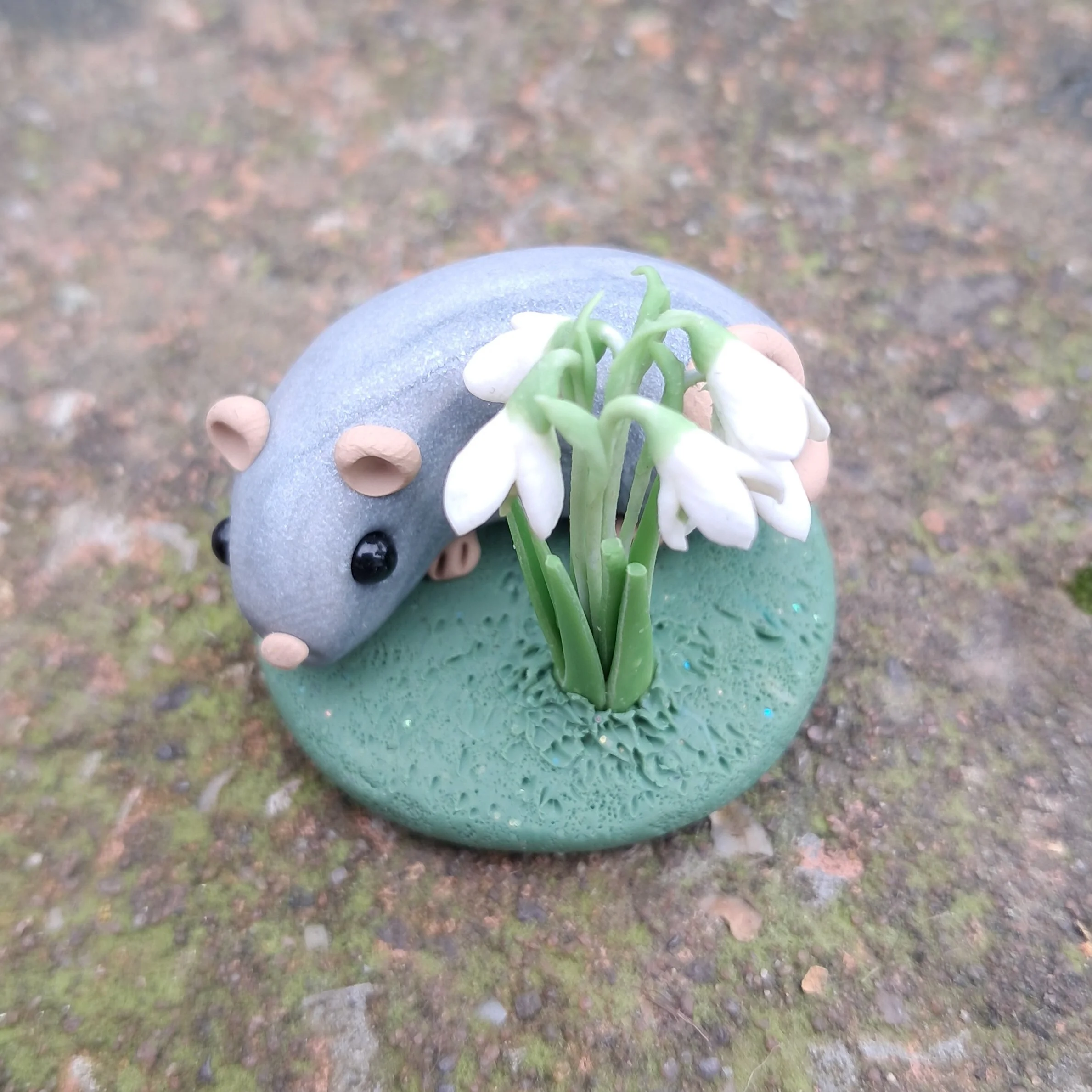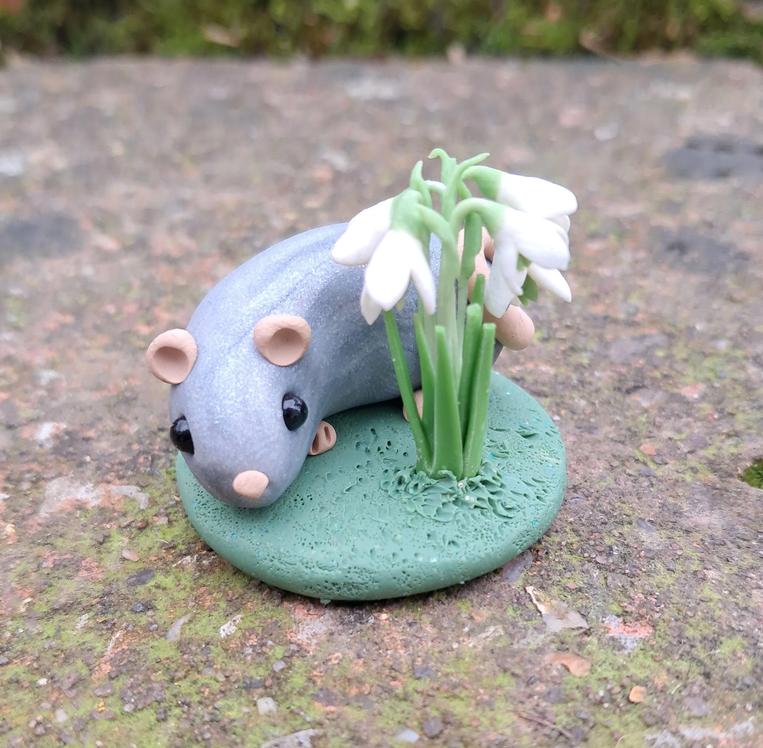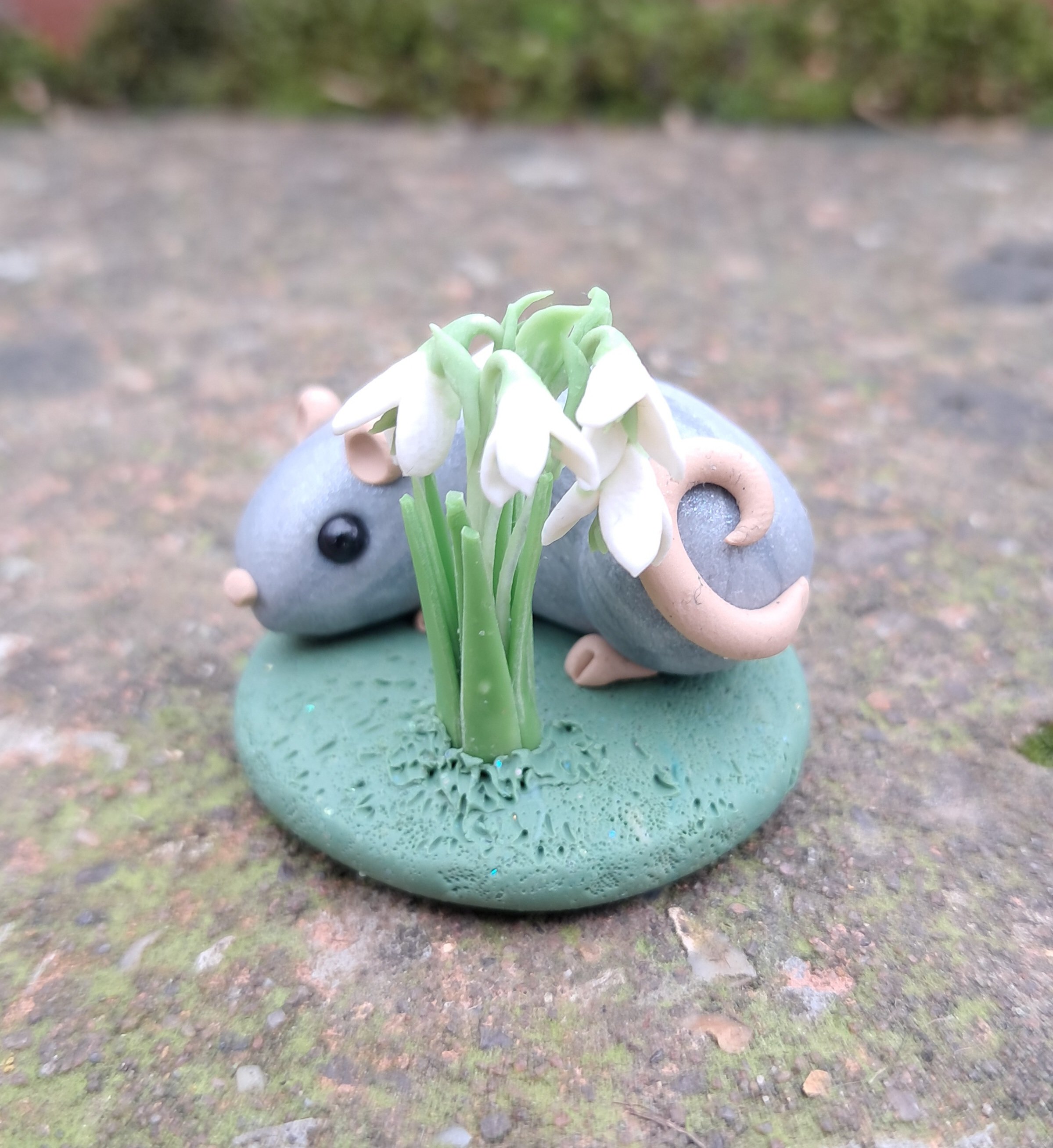 Beautiful decoupaged wooden toadstool created by Decoupage by Sharon just for the Minis. This is the largest in a series of 3, coming in at just over 6 inches tall. Two little black Minis are playing hide and seek on it.