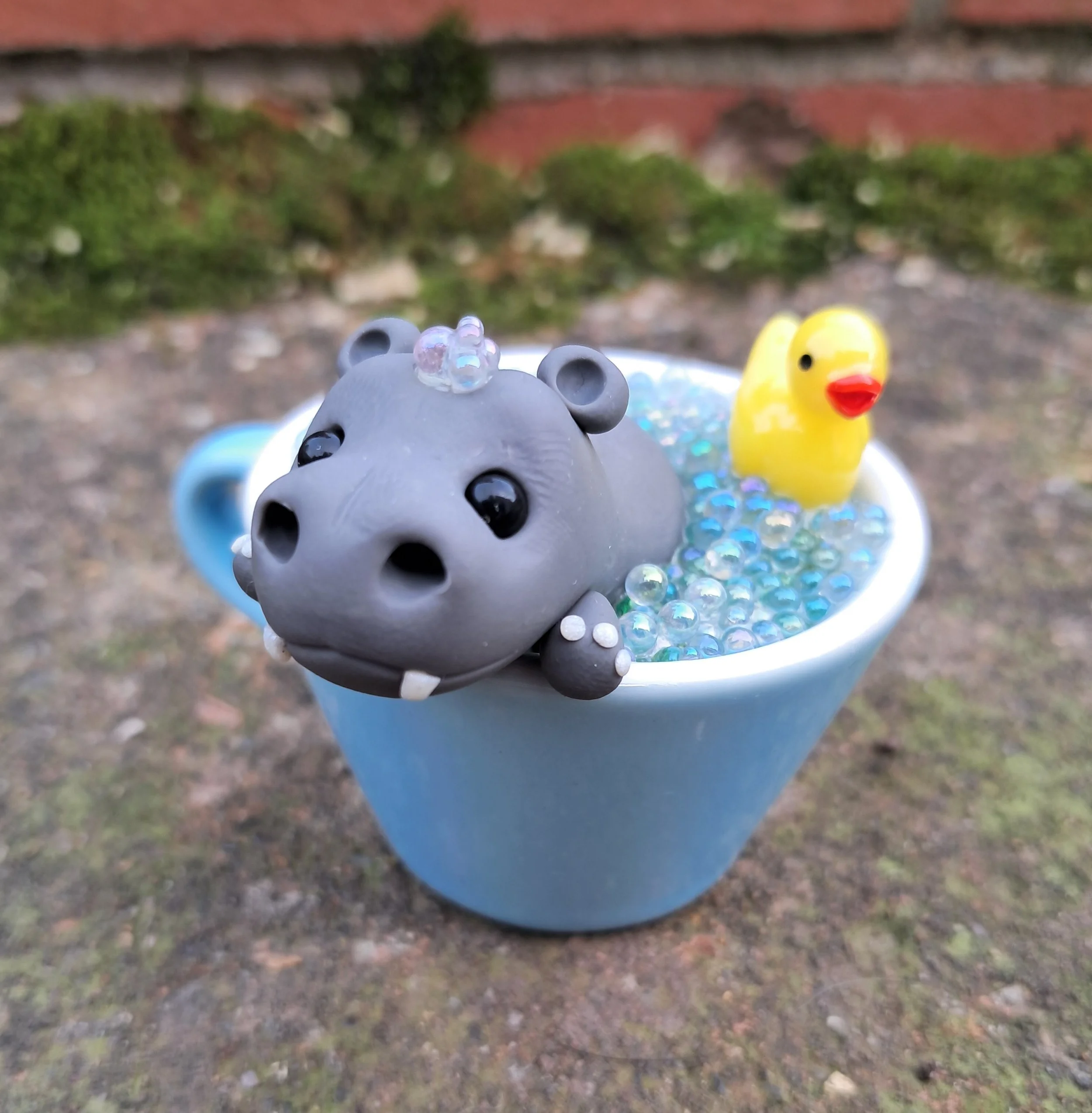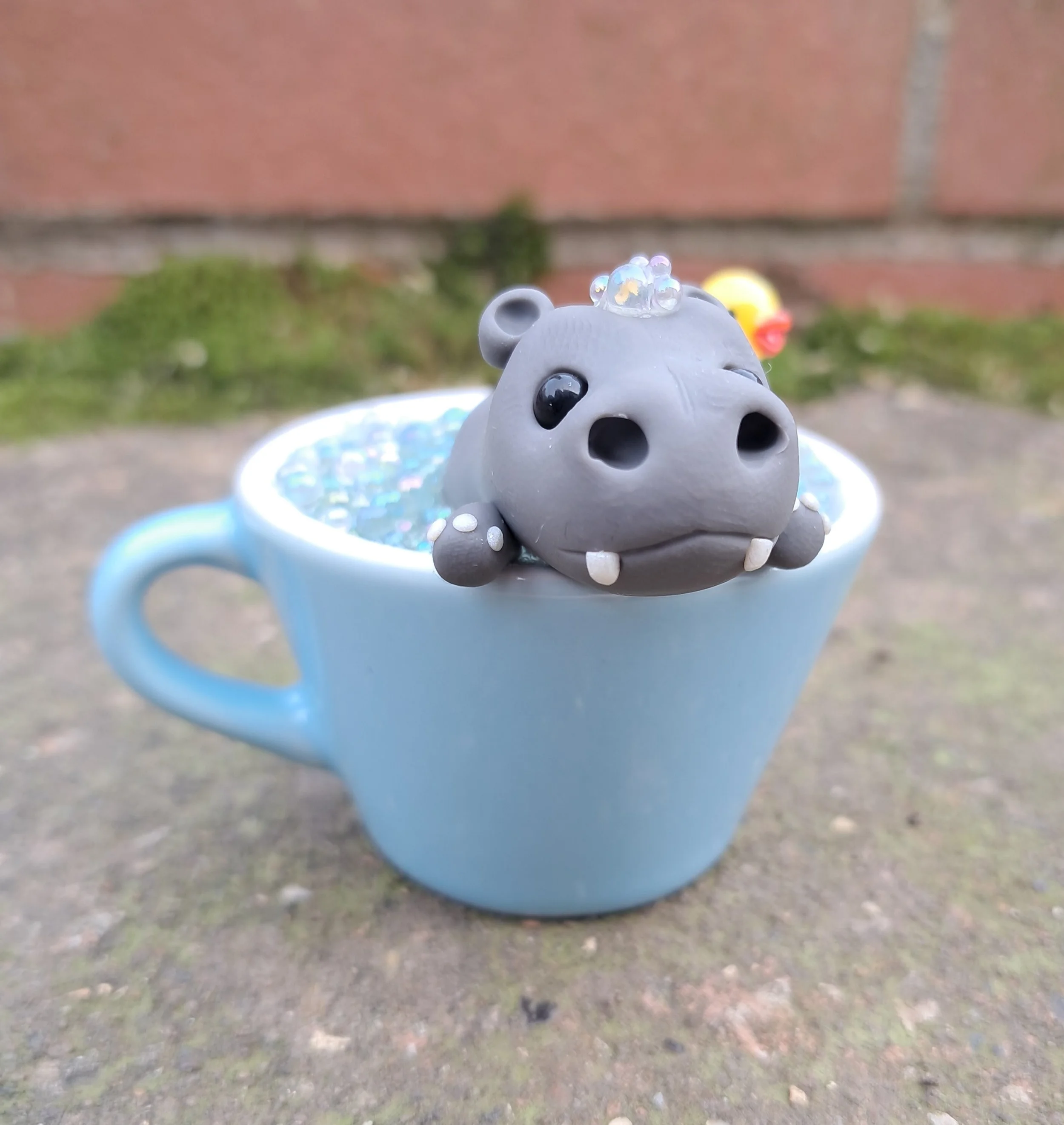 Cuddly little Hippo taking a bubble bath in a tiny green teacup with his ducky friend.