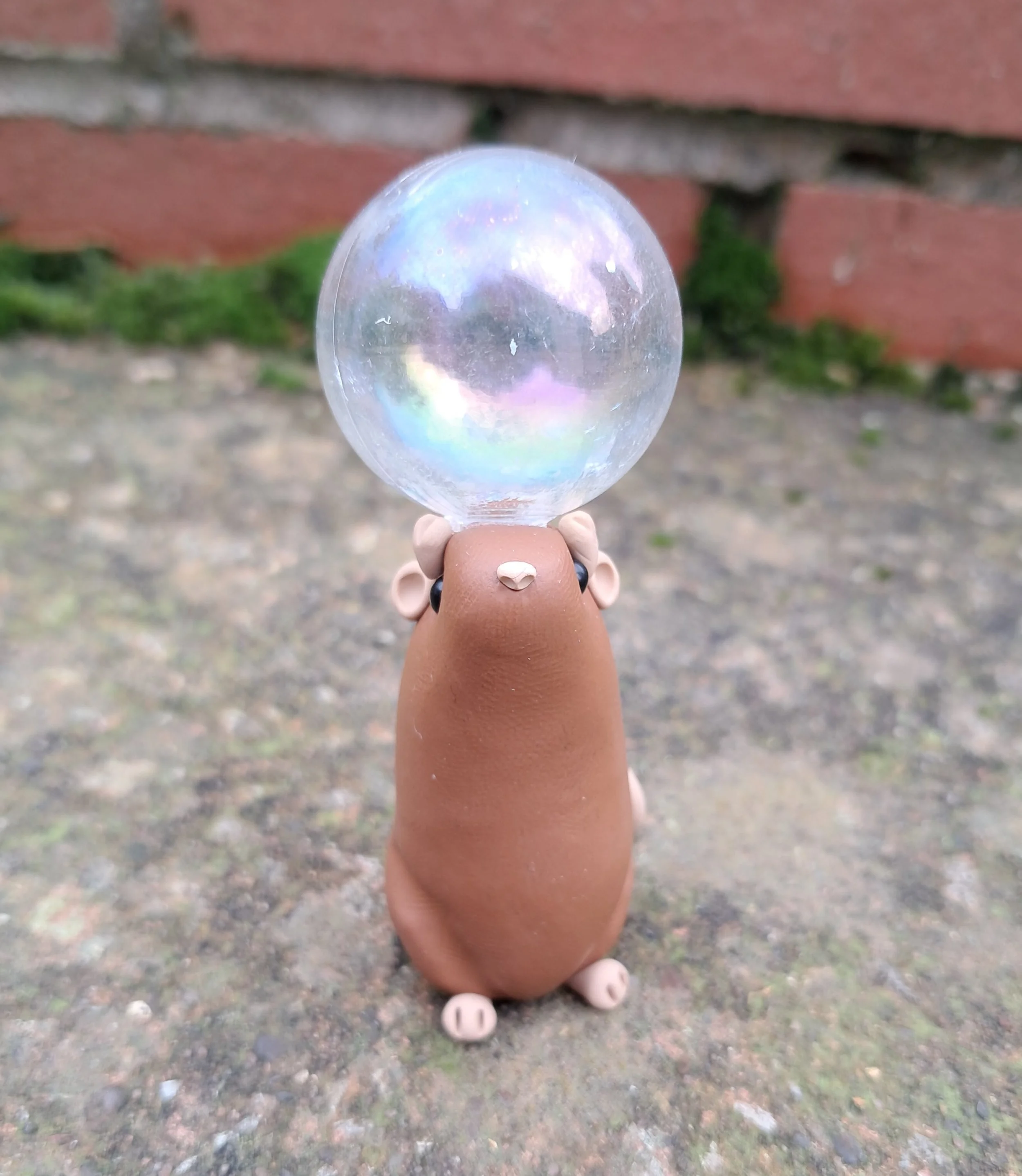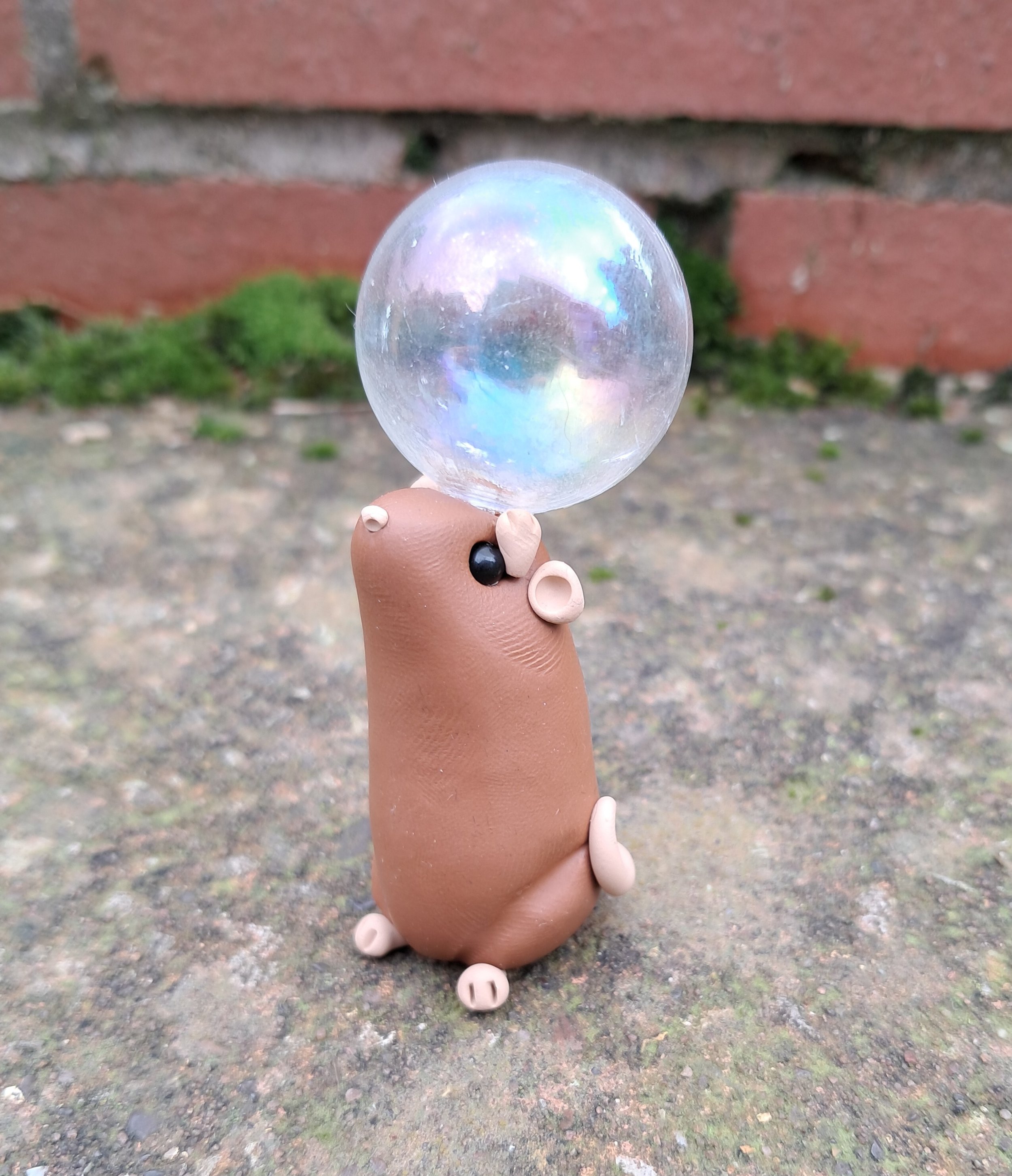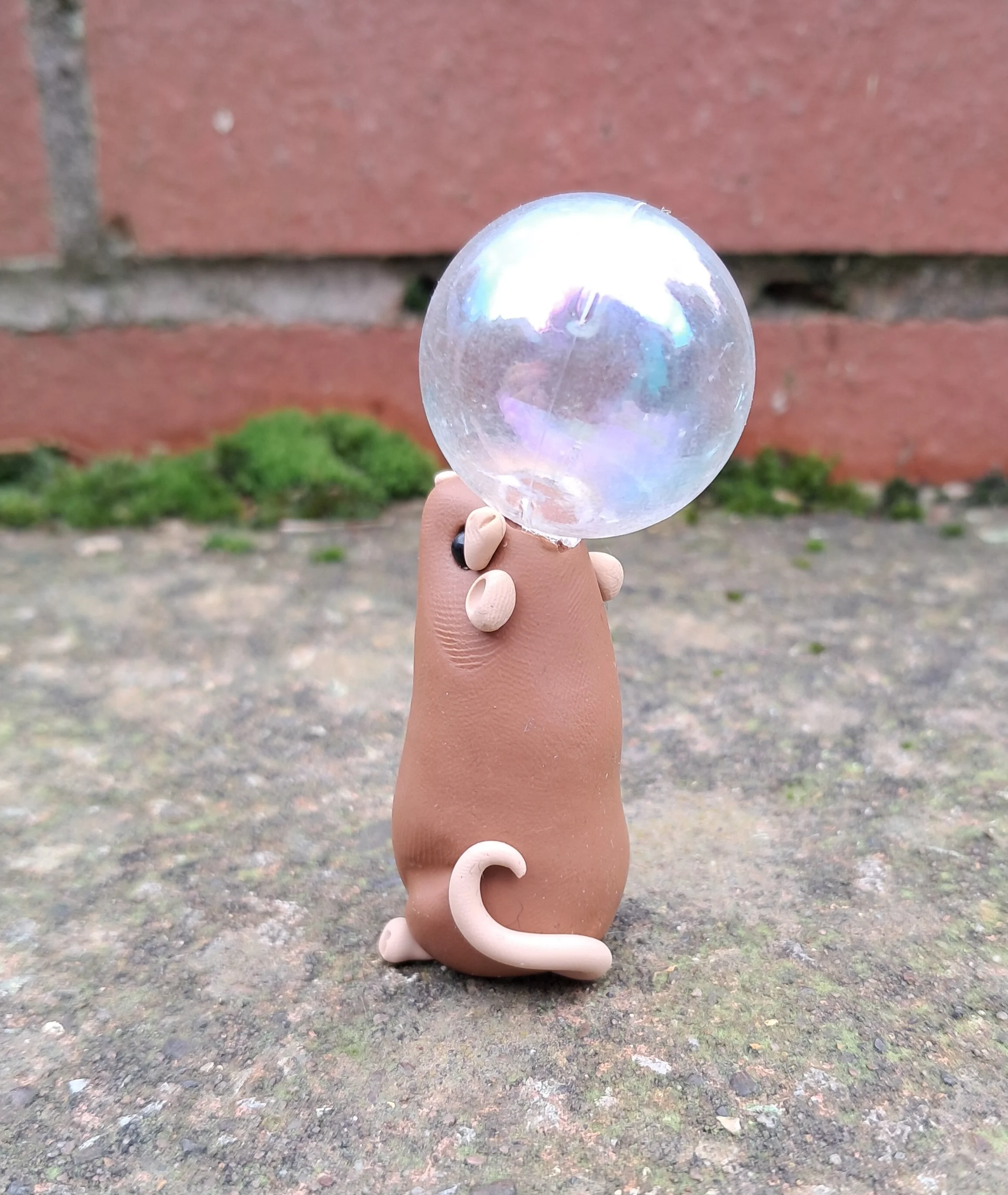 Catching bubbles is very tricky! This little guy has managed it with a big one. I do hope he doesn't float away! Cute little brown Mini holding a “bubble” above his head. Around 3 inches tall to the top of the bubble.